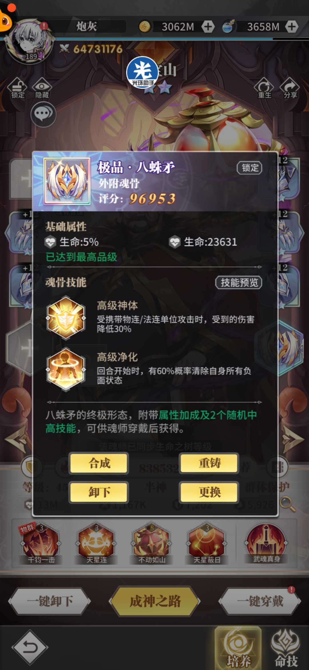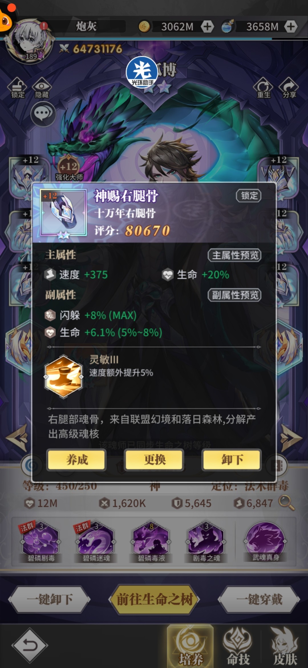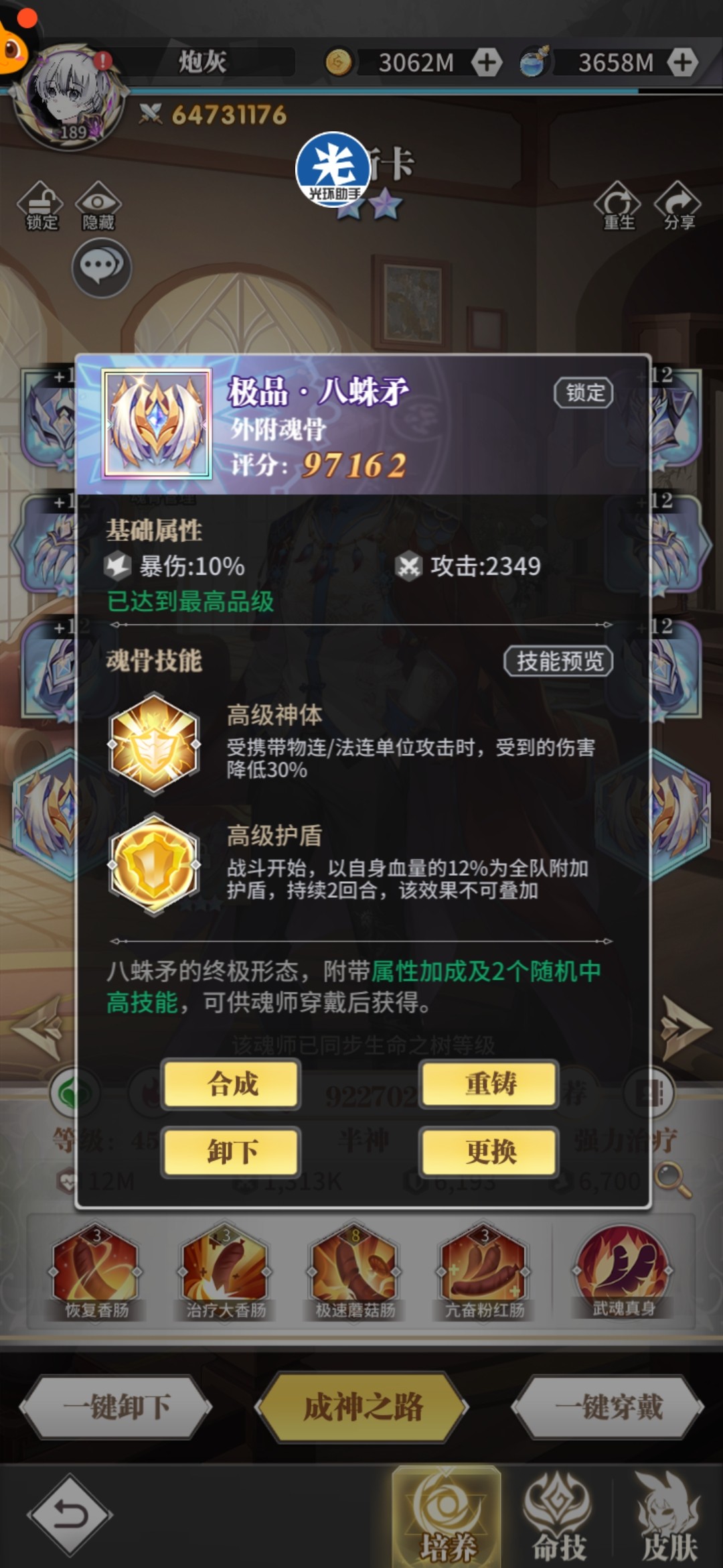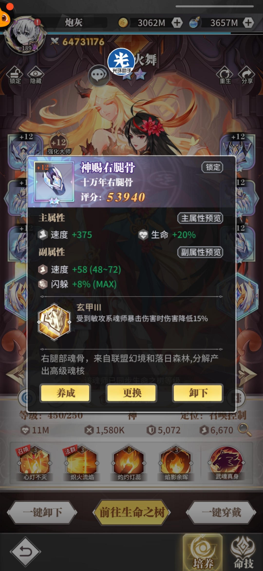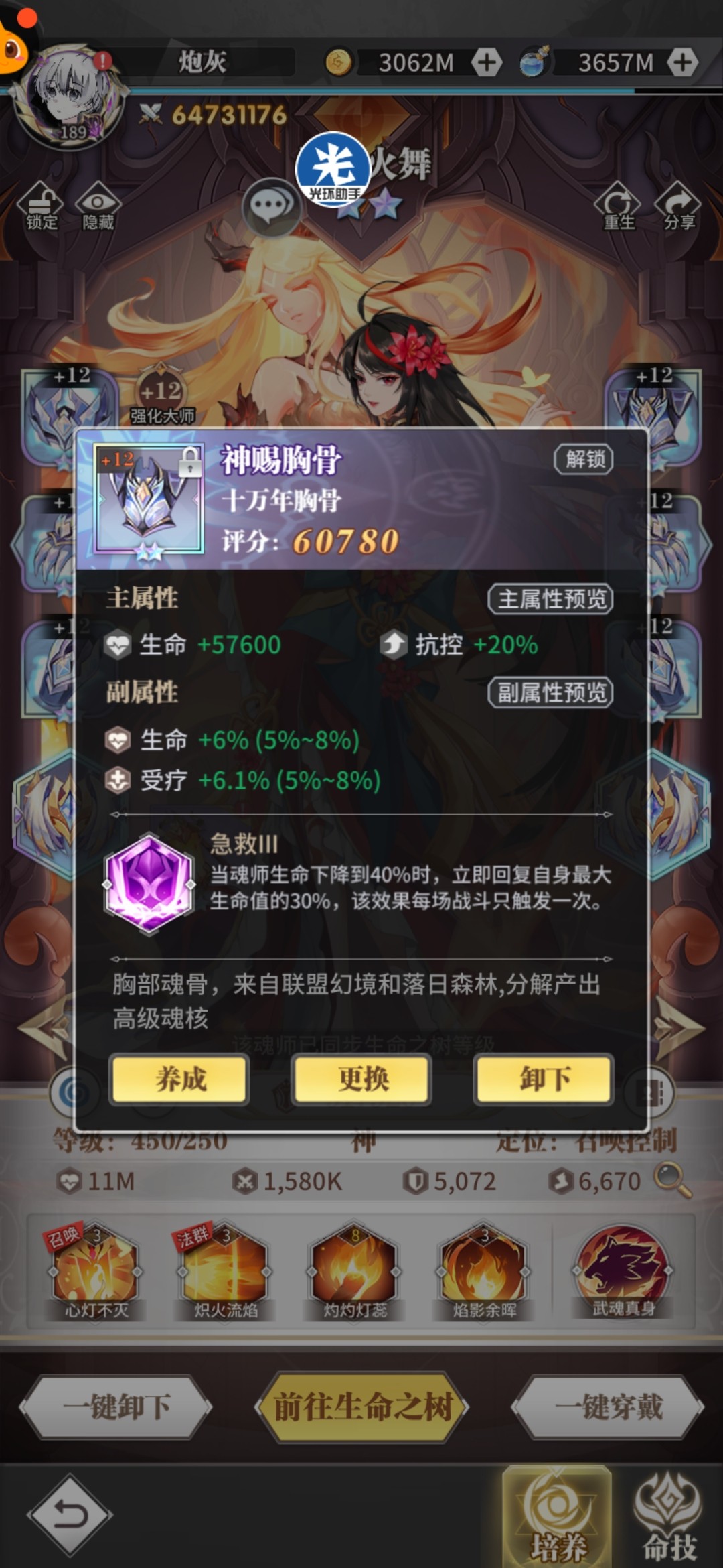 外敷魂骨+命技:炽心火舞作为火系灼烧核心,外敷必须肉一点保证生存能力,后期该魂师非常肉,灵护、神体、神赦、闪避优先、迅捷/裁决,副属性3%攻击百分比+351防御。