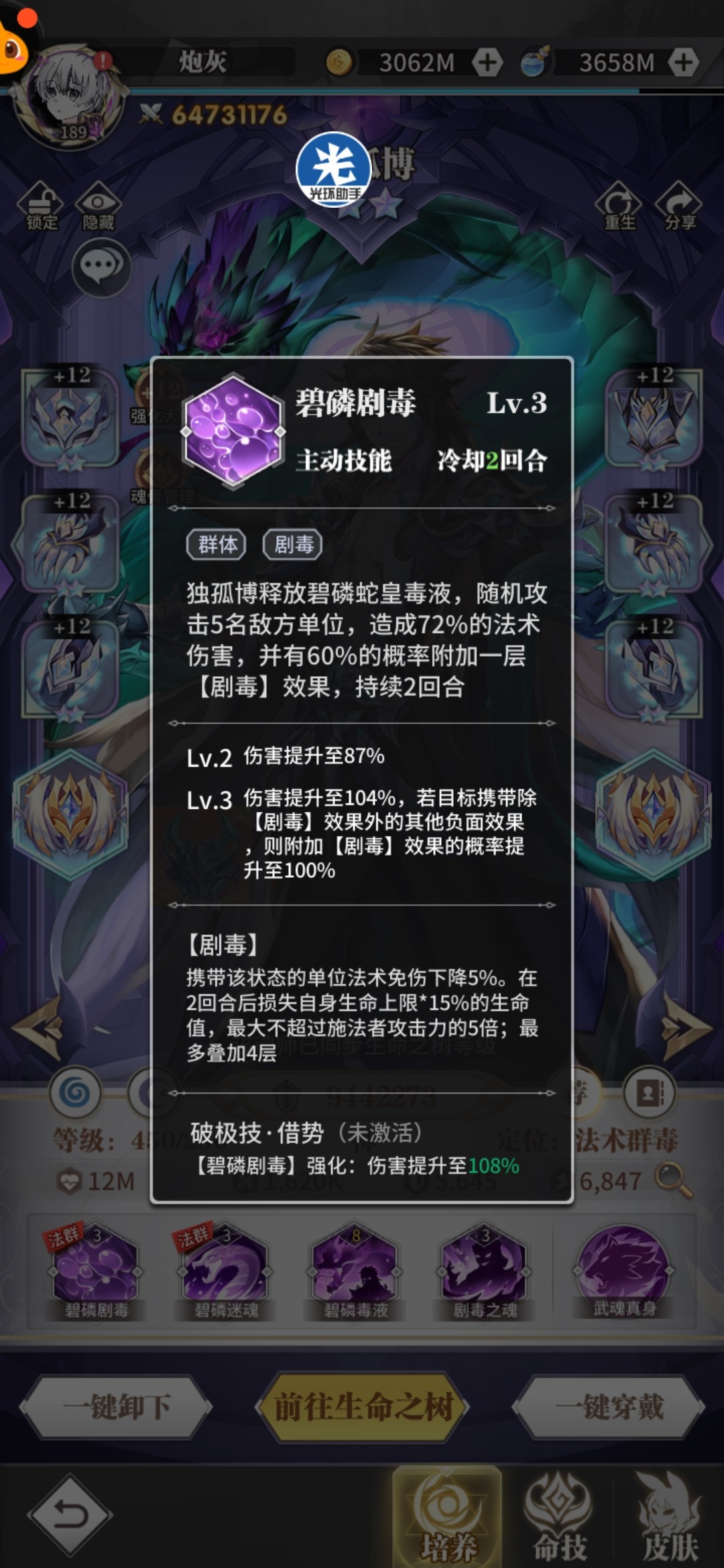 老毒物作为剧毒流扛霸子,拥有自己特殊一派的风格,剧毒配合第二回合的暗器阎王贴是一大杀器,有的人老毒物很好用,有的人觉得很垃圾,老毒物该怎么配呢?老毒物跟火系魂师很相似,都是靠负面效果打伤害,一个是火一个是剧毒,食神为什么那么牛和奶多,就是因为队友负面伤害高造成的,剧毒也要看层数,最多叠加4层,每层效果可以降低对面5%法免+2回合毒发作自身生命15%上限(不超过独孤博攻击5倍),什么概念呢?毒的层数越高,独孤博攻击越高,就可以瞬间蒸发对面,无视免伤和肉。