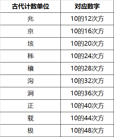 原来,早在我国的东汉时期,就出现了比“亿”更大的数词,它们就是:兆、京、垓、秭、穣、沟、涧、正、载、极。这些数词也被称为“大数”。