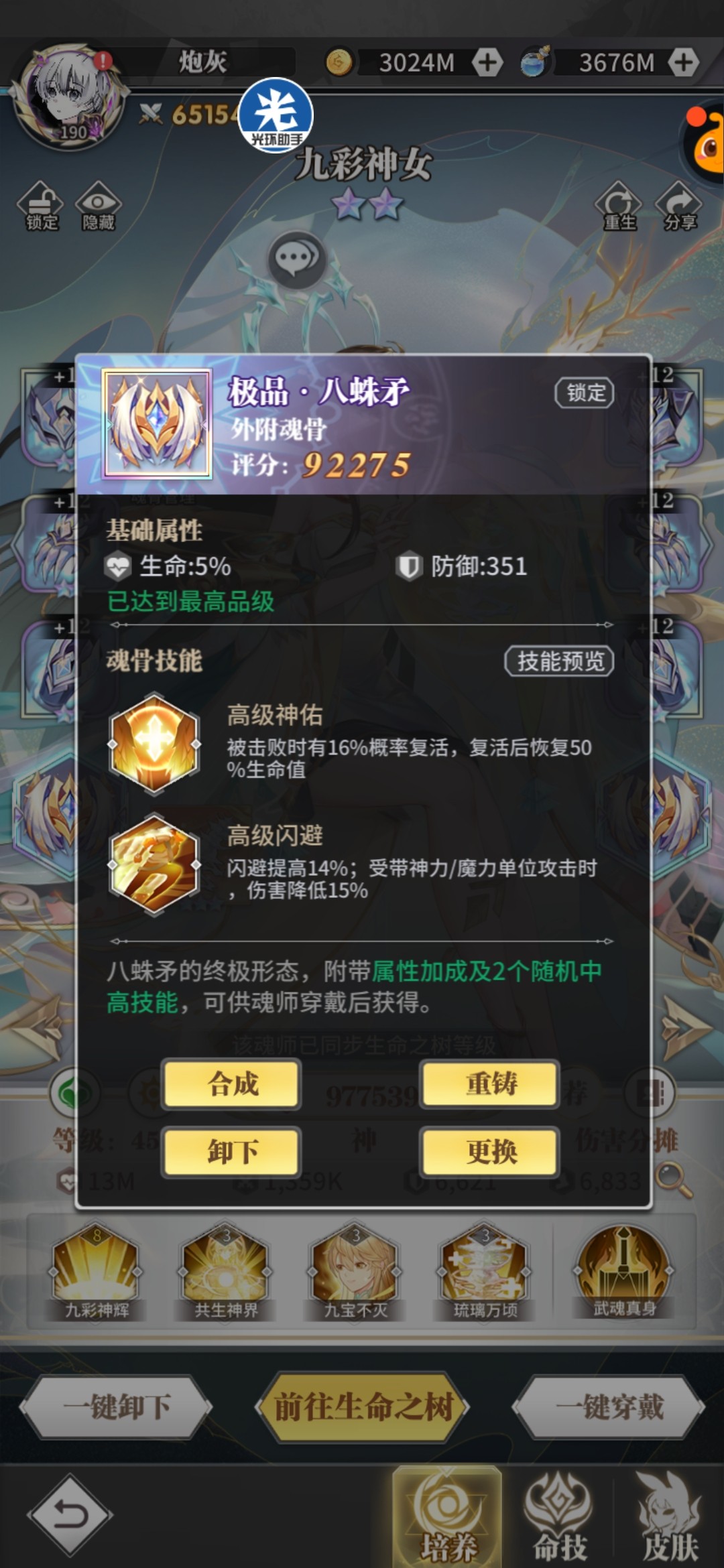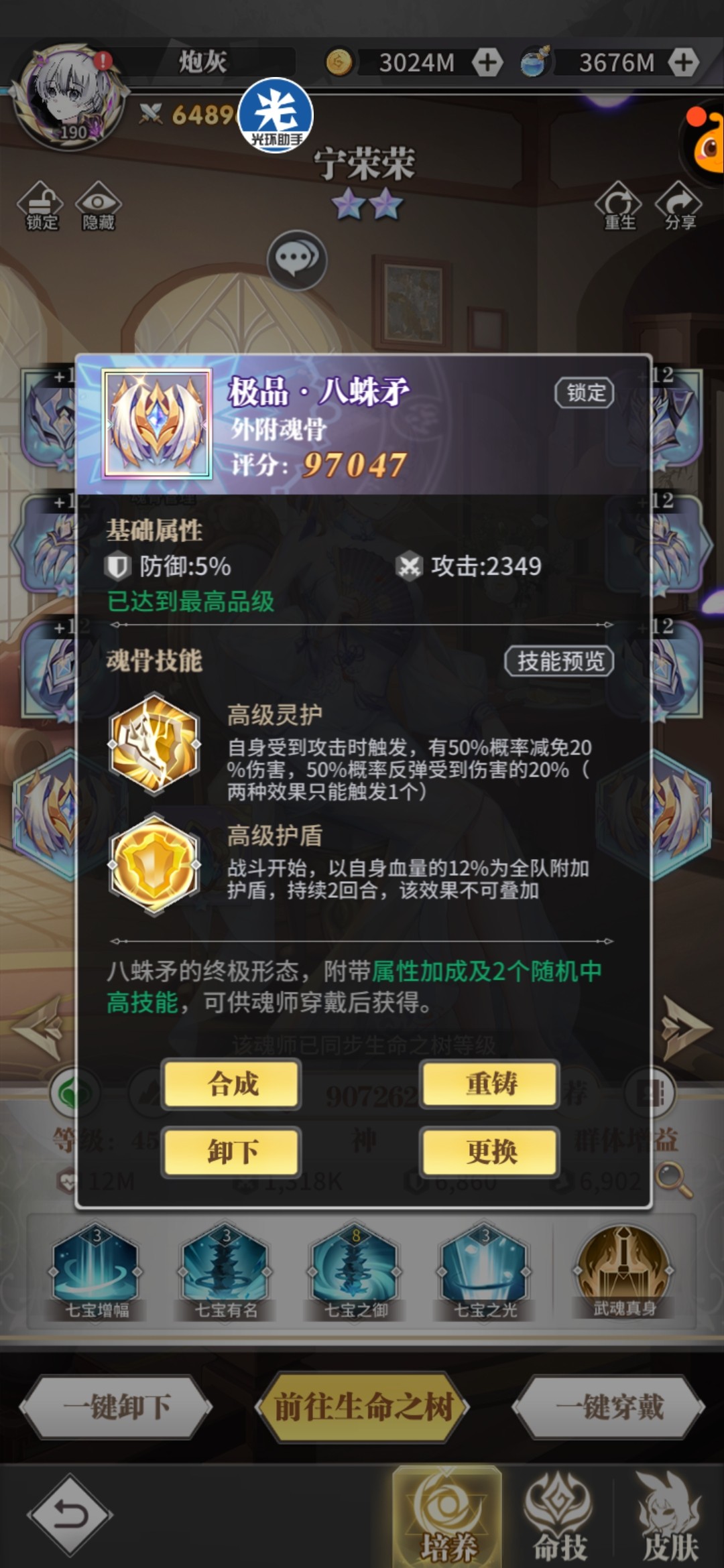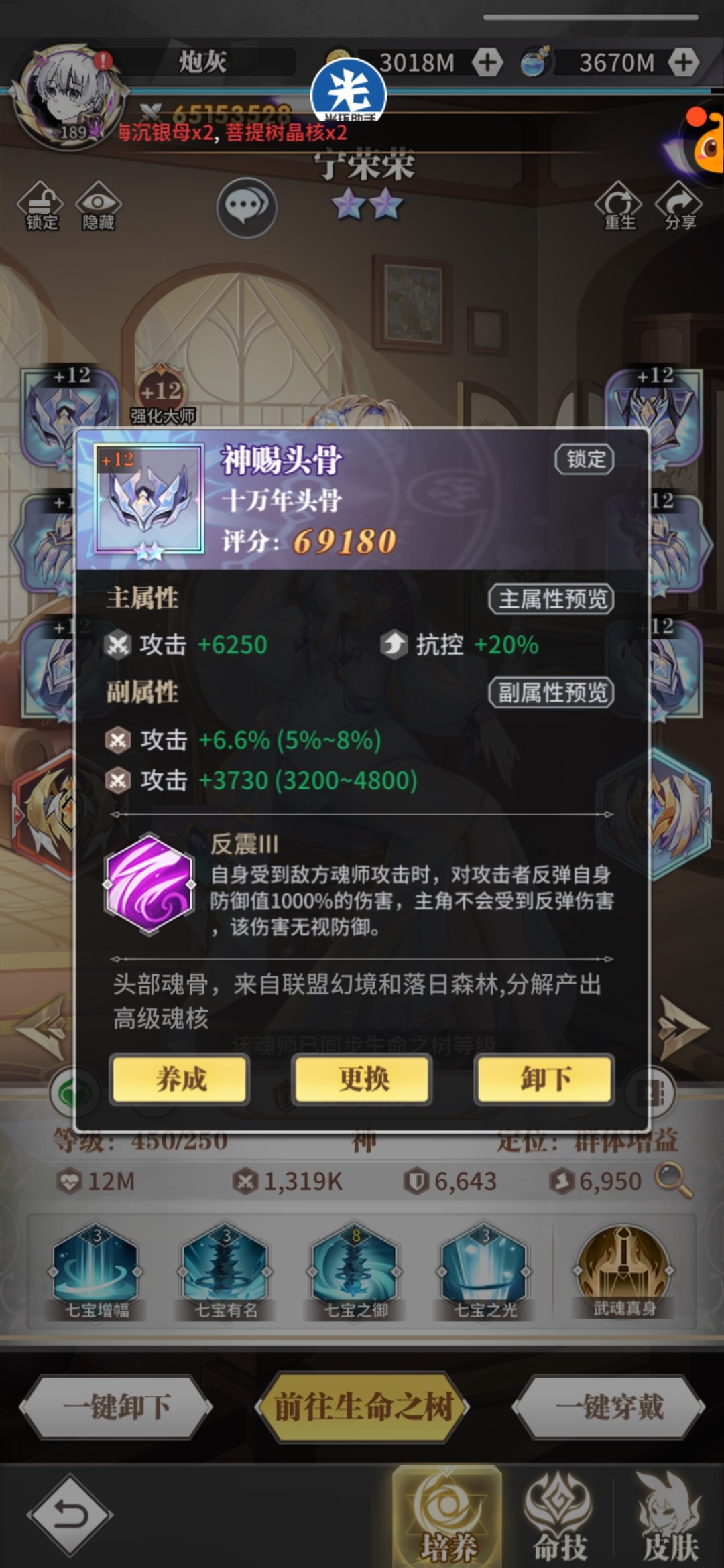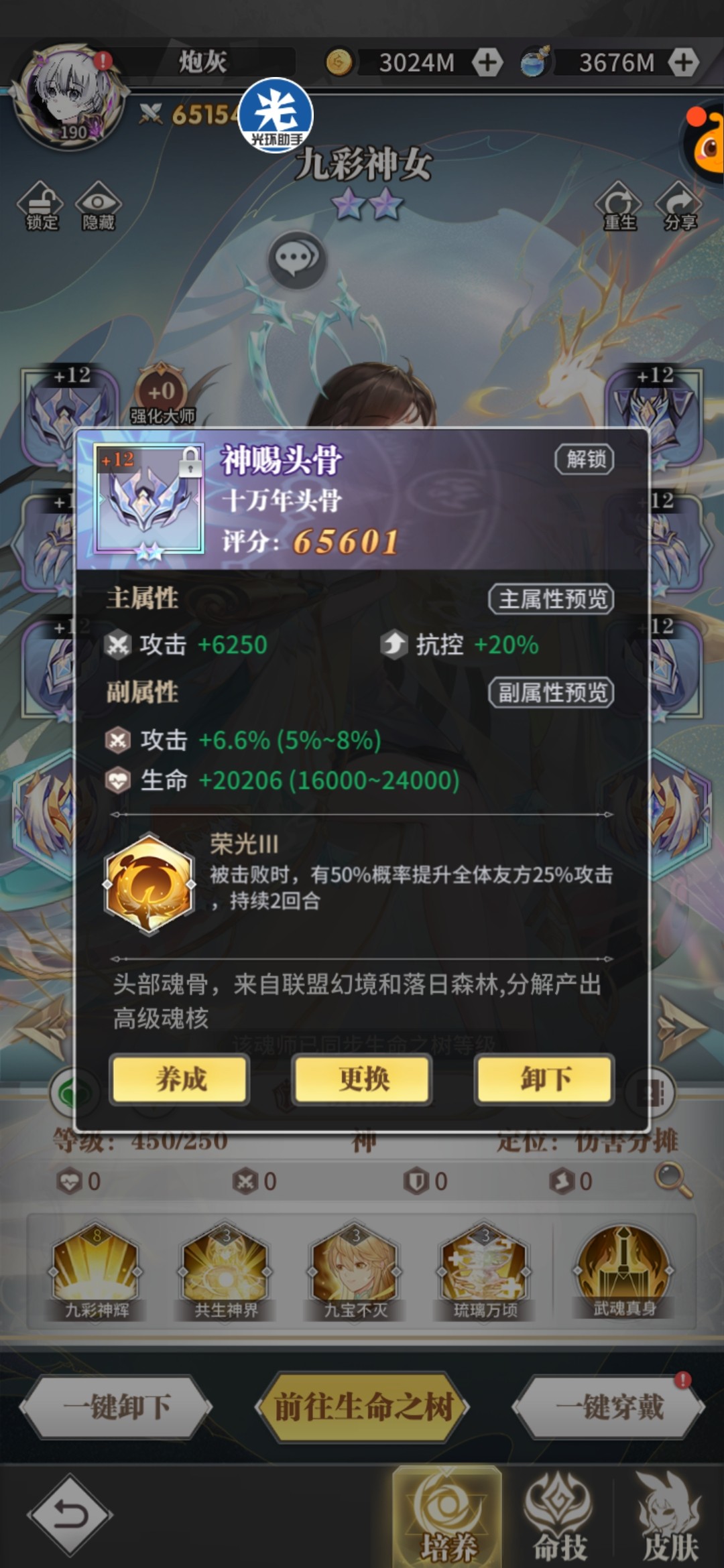 头骨:荣光/反震,副属性攻击百分比+攻击值,荣荣持续治疗量和复活血量都跟攻击相关。
