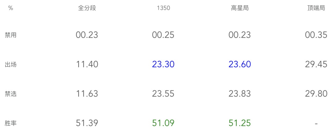 但是奇怪的是在削弱了几次之后其在全分段的胜率还是保持在了51.39%,巅峰赛1350+的胜率保持在了51.09%,高星局的胜率保持在51.25%,其中巅峰赛1350+与高星局的出场率非常高,分别是23.30%和23.60%,仅次于吕布,官方之所以对花木兰进行连续的削弱是因为还是太强势,其一是技能机制有点“完全”,上面文章开头也提到了有着减伤、沉默、控制等等等效果,其实每一个技能机制单独拿出来都非常的有实战性,更何况是集于一体,其二是其在对局中爆发能力非常强大,在高星局中经常可以打出不错的输出效果,其三是花木兰在当下版本里野区野怪刷新的速度很快,这样在对抗路里让其有了一些优势出来,这就是为什么现在用花木兰上分还是非常推荐的。