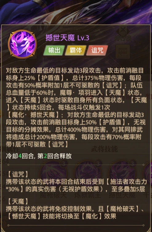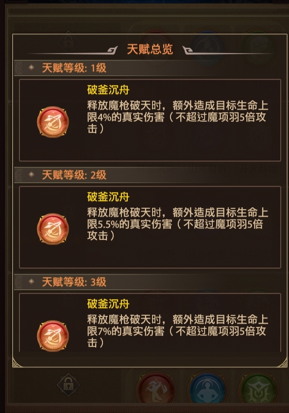 TOP2:英雄培养方向从项羽技能形态可以看出是继马超之后的第二位:“献祭流”,马超需要队友的牺牲才能发挥最大的实力,而项羽呢则是根据整体队伍的总血量百分比,(队伍整体血量在战斗界面上方显示)