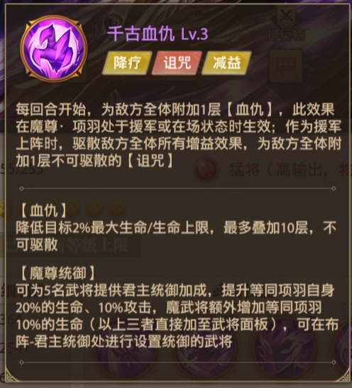 天魔状态下的项羽输出能力提升非常之大,此外项羽还拥有这抓高攻和低血的特定攻击方式并且这里要注意,项羽还是稀有类型的君主型的武将,把他放在支援位置可为上阵武将提供加成,魔阵营额外增加一些属性。相比作为支援武将而言,项羽更适合上阵作为主C,几乎接近全能的英雄,是目前版本最强的一位C位英雄没有之一。那么他的搭配和阵容该如何选择呢,请看下方阵容搭配和出装搭配。