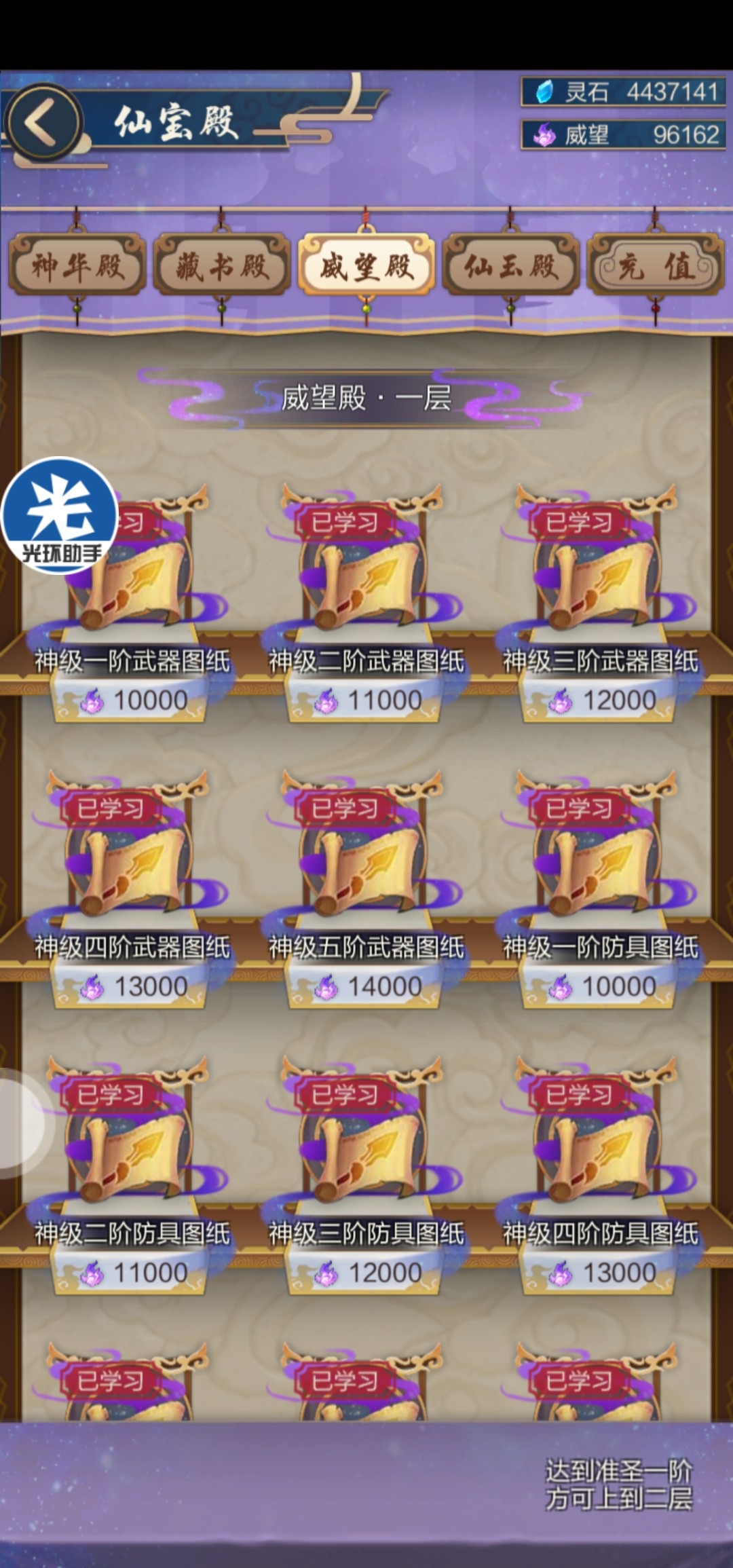 威望:威望用于虚空购买神1-5的装备图纸,如果道友无神五鼎,建议炼制神三,攒势力战获得的星魂炼制神2器鼎,然后再炼制神五装备哦。