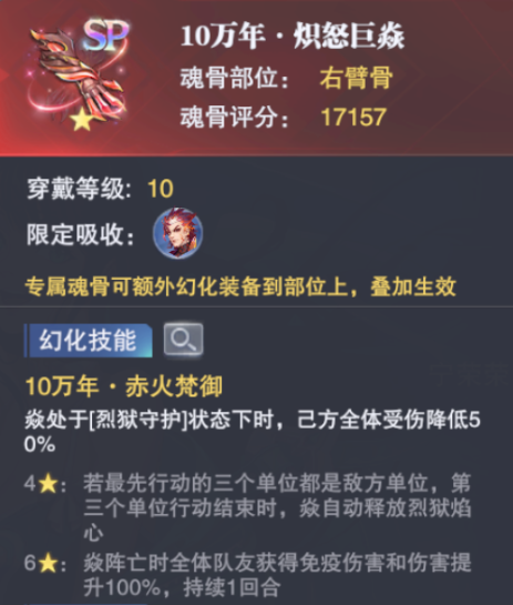 首先我们还是来看焱的专属魂骨,其实焱的角色定位就是减伤+增伤,其余方面虽然也能有所涉猎,但效果并没有这两个核心作用大,那么这个专属魂骨的作用有在哪呢?