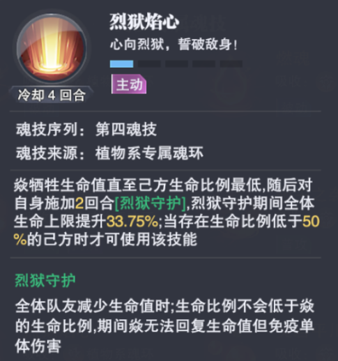 这里我们简单说下焱的4-1技能【烈玉焰心】,使用后便能触发【烈狱守护】状态,主要效果为全队队友的生命值不会低于焱的生命值,同时焱虽然无法回复生命但可以免疫单体伤害,另外状态结束时如果焱没死,则全队都会回复生命值,且10万年魂环还有使用此技能时驱散我方魂师所有异常状态的效果。