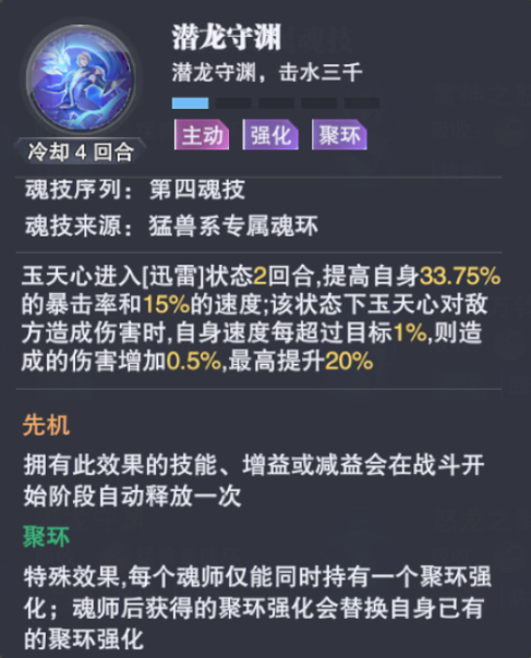 接着玉天心的4-1技能【潜龙守渊】是一个自主增伤型的聚环技能,而联系到专属魂骨的6星效果,此技能在主动使用后可以联动使用1技能且有增伤效果,不过我们同时也需要注意到【潜龙守渊】技能是有先机效果的,因此未来在战斗中,我们可以考虑开局第1回合主动再次使用4技能然后来加强1技能的伤害,亦或者在拉入持续战的战斗中利用4技能和1技能的联动来提升玉天心的输出能力,反正6星效果为玉天心提供了更多的战术可能性。