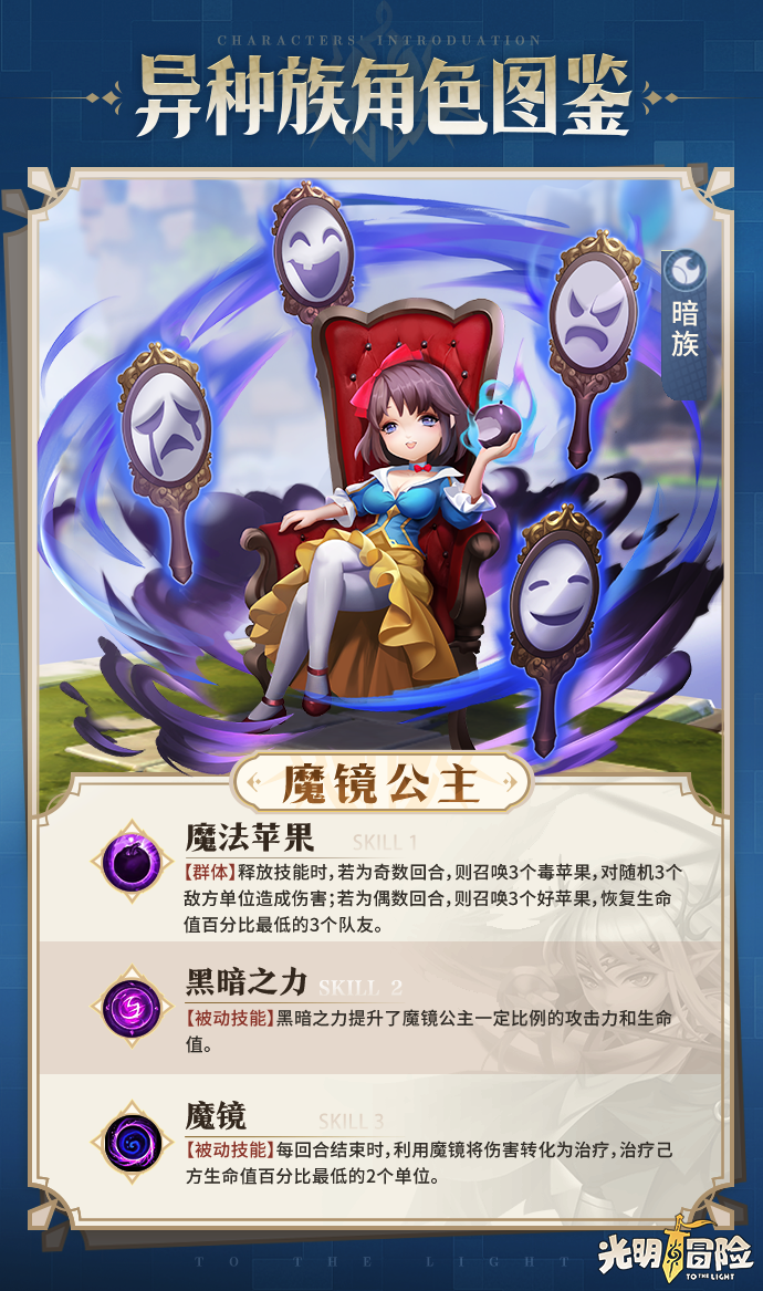 【角色图鉴】魔镜公主:光明大陆还有白雪公主?没错!又是黑化版灼热阳阳发布于 2022-11-14关注光明大陆上最黑暗的女人!魔镜公主——白雪!嗯?毒苹果没送走她吗?没!毒苹果从始至终为她所用!嗯?不是皇后的魔镜吗?白雪:笑话~那向来是我的魔镜! *信息仅供参考,请以实际上线为准魔镜公主名片呈上!魔镜、苹果,还有皇后的座位勇士们若坚定地追求光明那与她的战斗是否不可避免呢?无妨!冒险家勇士从不害怕战斗!