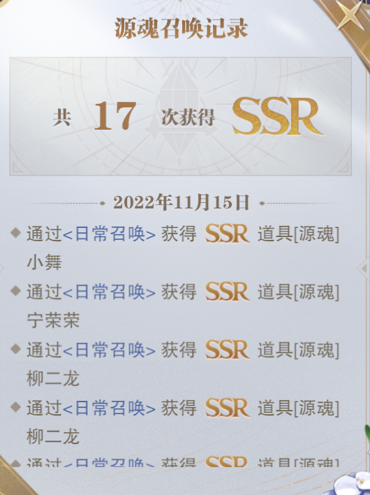 接着针对源魂召唤,维一在更新后已经共计召唤了441次,召唤到的SSR级别源魂是17个,换算下来的概率是3.85%,比官方公布的3.67%要拿稍微高一点,其实也差不大多,反正总体上的感觉就是大坑......慢慢填吧。