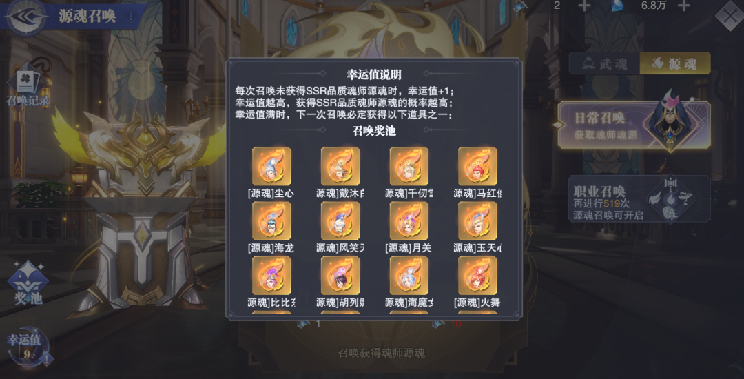 首先想要提升不同魂师的源魂力,需要通过在柳二龙处新增的“源魂召唤”来随机抽取,抽取逻辑和过去的武魂觉醒非常类似,而抽到SSR级别魂师“源魂”的概率为3.67%,经过实测目前维一一共是抽取了481次,抽到了SSR魂师源魂共计18次,概率为3.74%,基本上官方公布的数据持平。(目前还未知晓SP级别魂师的源魂需要通过何种方式才能获取)