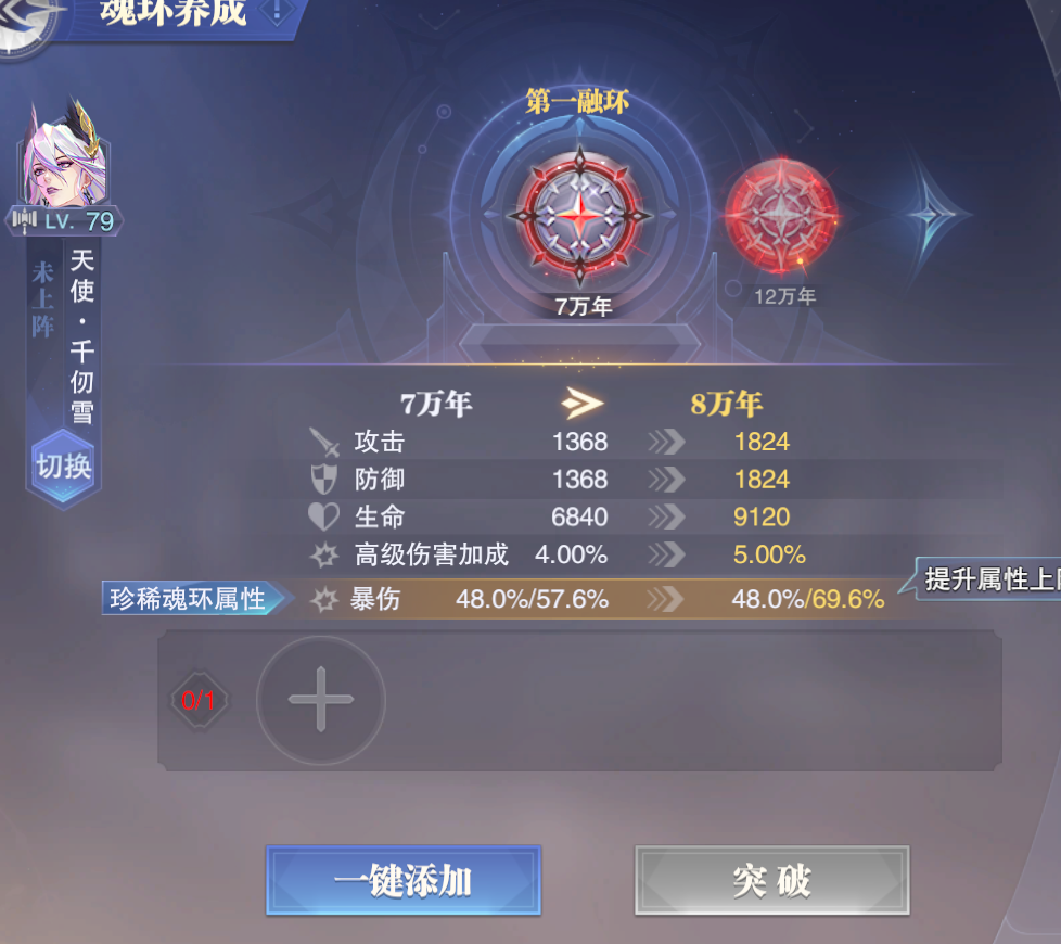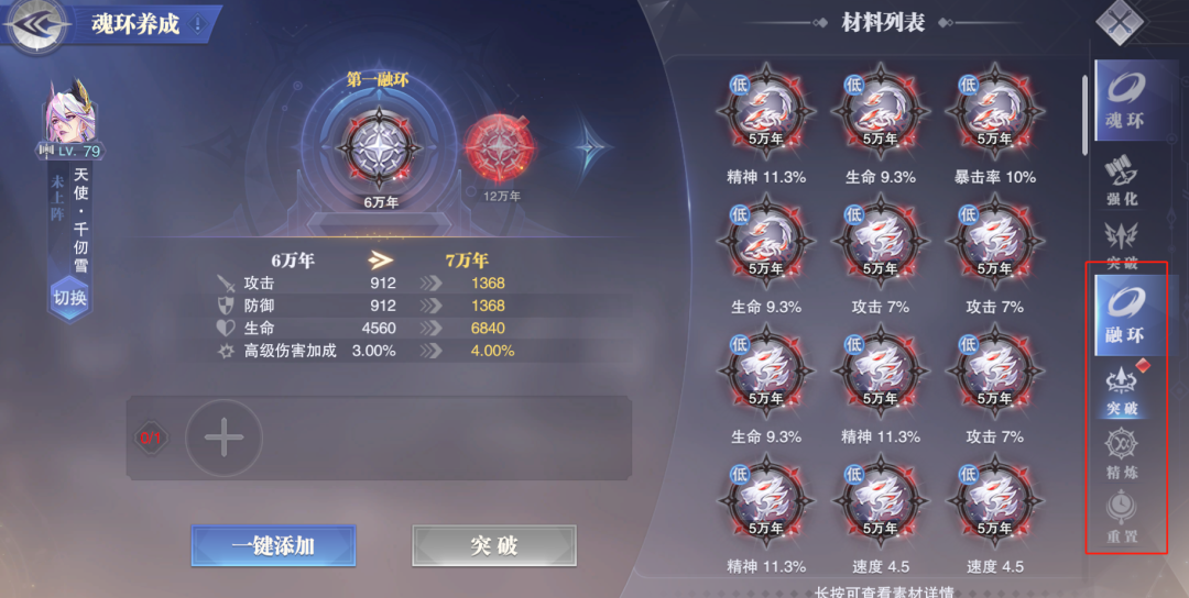 突破:耗费任意的5万年同系魂环进行突破,5-12万年需要1个5万年魂环,12万年以上需要2个5万年魂环,主要是提升魂环全属性和额外提升此魂环原本特殊属性的上限,这个可以参考下图