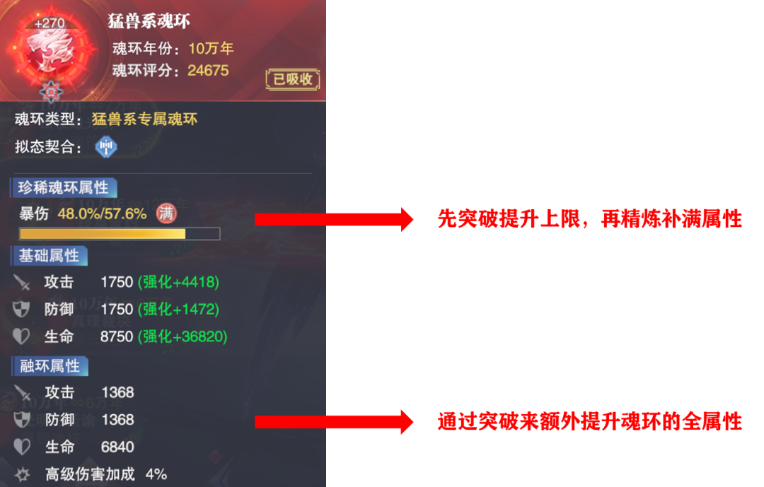 精炼:耗费同样属性的特定年限魂环对魂环原属性进行上限提升,例如原来的魂环是10万年48%的暴伤,则在融环精炼后,其可以提升到80%多甚至是更高的暴伤上限......这个也可以参考下图