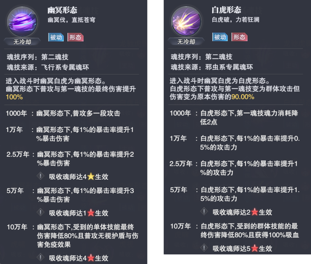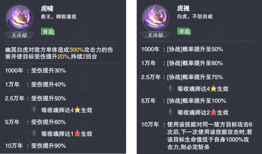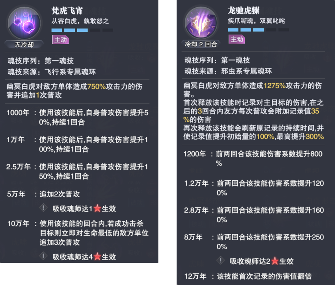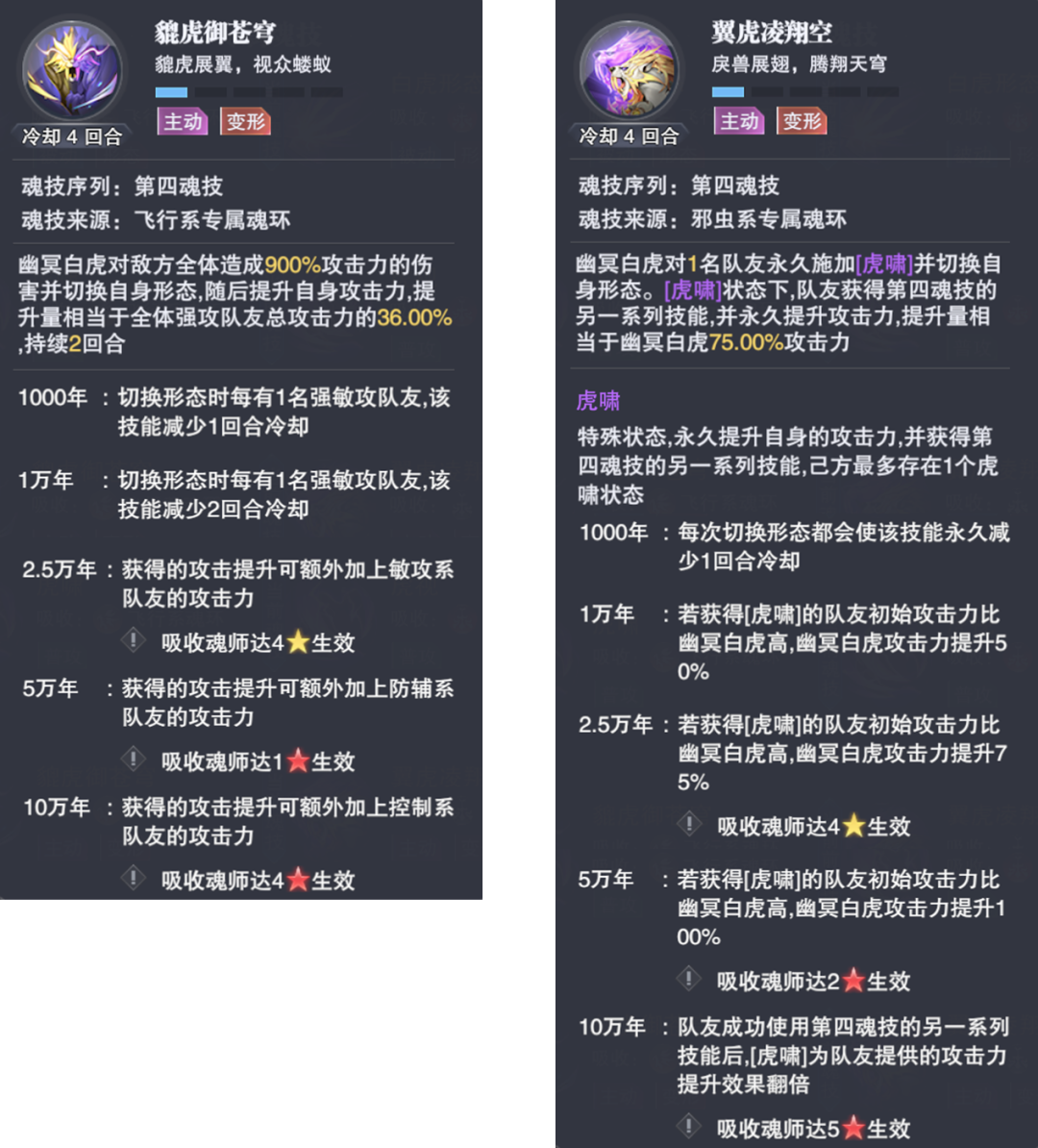 最后的两个4技能则是幽冥白虎的关键技能,4-1【貔虎御苍穹】是提升自身的攻击且转换形态,而4-2【翼虎凌翔空】则是提升指定队友的攻击力且让其拥有能够同时激活两个4技能的效果,相当于平时我们都只能带两个4技能中的一个,但有了【虎啸】的效果后,指定魂师则可以带两个4技能同时上场......且魂环年限和另一个人4技能所带魂环年限一致。