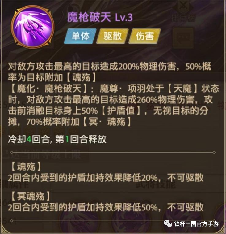 对敌方攻击力最高目标造成伤害,并有概率附加[魂殇],如果项羽处于[天魔]状态时,魔枪破天将切换为魔化·魔枪破天,在攻击前会减少目标50%的[护盾值]并无视目标的分摊效果,攻击时将有概率给攻击目标附加[冥魂殇]状态(注:冥魂殇将在2回合内降低护盾50%效果)。