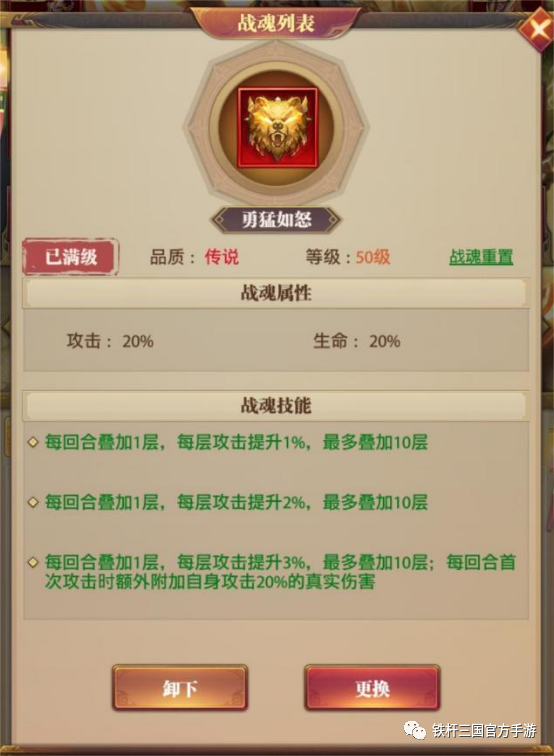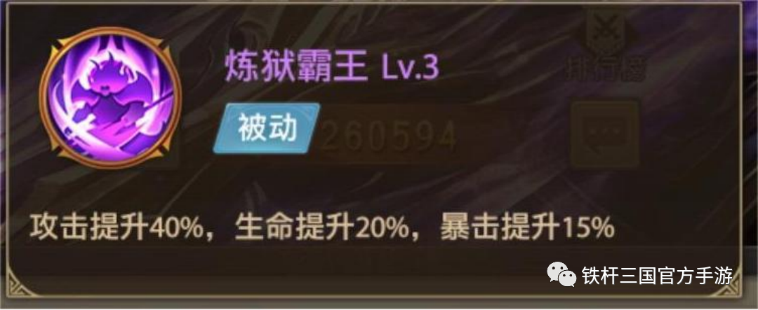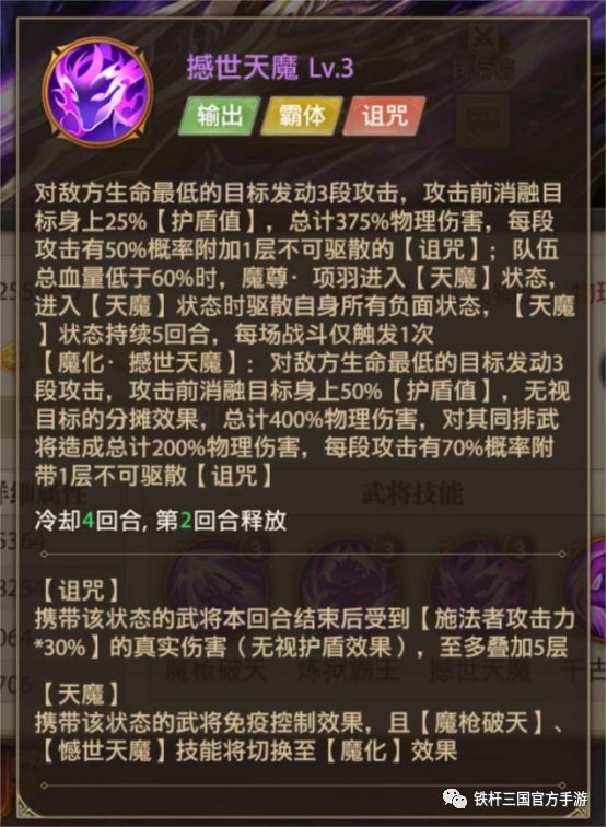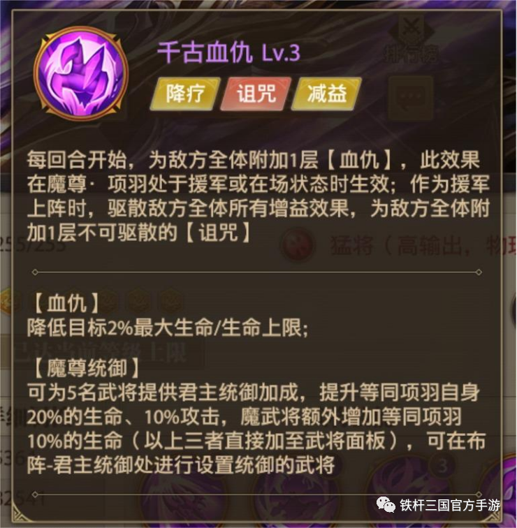 每回合开始时对敌方附加1层[血仇],作为援军上场时会驱㪚敌方所有増益效果并附加1层[诅咒],[魔尊统御]为5名武将提供统御加成,提升等同于项羽自身20%,10%攻击,魔武将额外増加等同于项羽10%的生命
