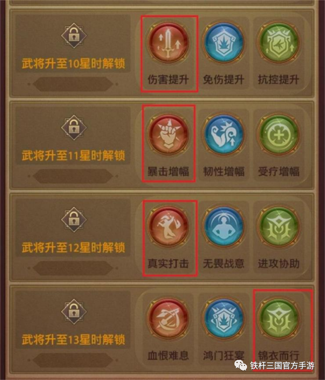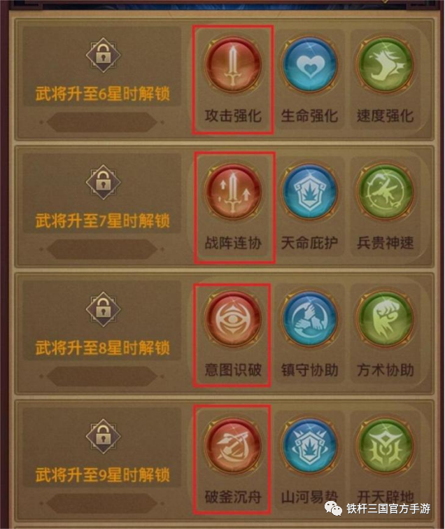 天赋选择,攻击强化,战阵连协,意图识破,破釜沉舟,伤害提升,暴击増幅,真实打击,绵衣而行。