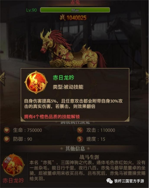推荐使用战马赤兔,因为赤兔马的被动技能[赤日龙吟]可提升自身伤害并且攻击时会附带自身30%的真实伤害,如暴击时效果将会翻倍。