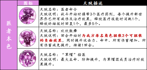 天赋说明:最大生命、防御大提升,为草帽一伙成员治疗时效果额外提升;