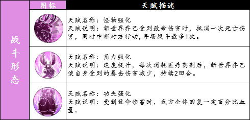 天赋说明:回合开始时为我方全员清除2个可清除的负面效果,同时提升一定百分比的攻击力、命中、所有伤害增加、所有伤害减免,持续1回合;