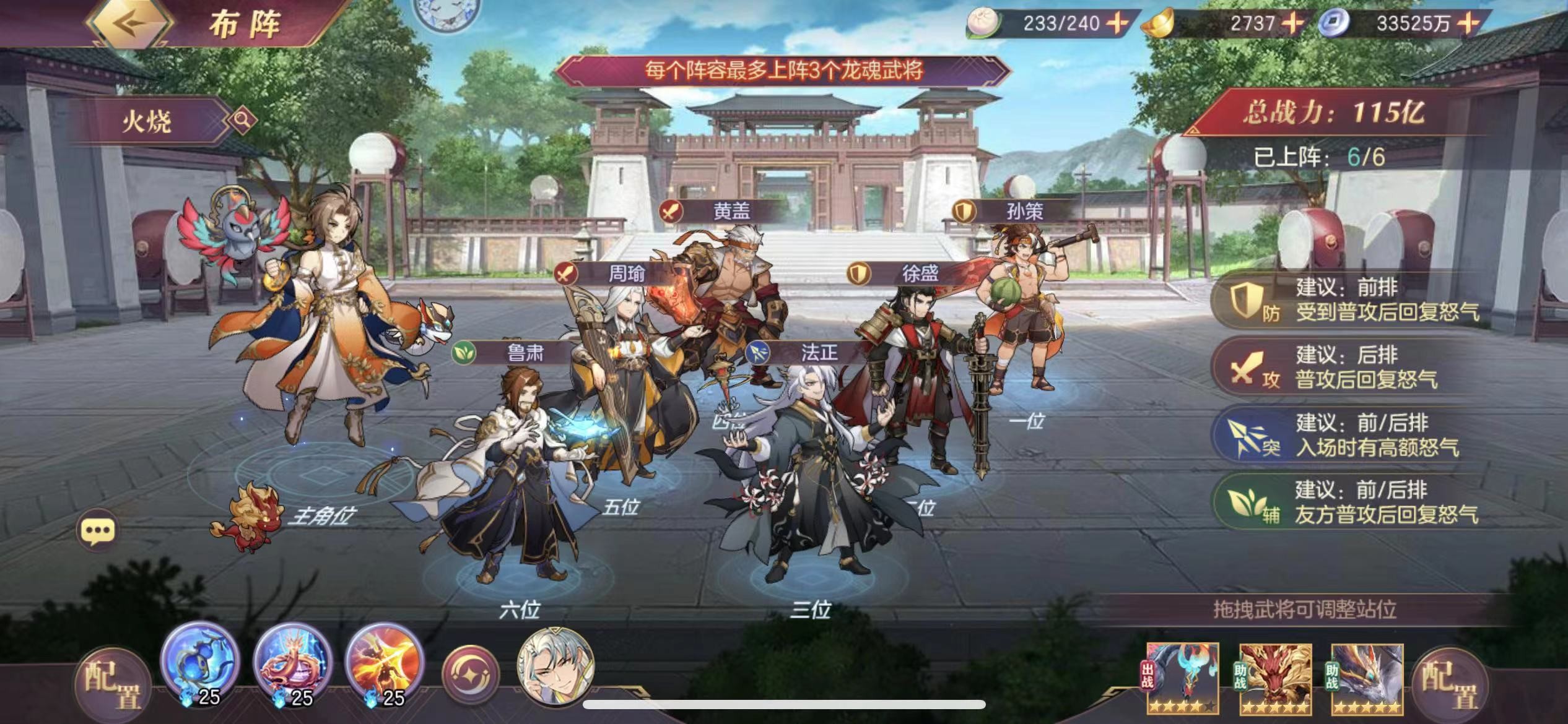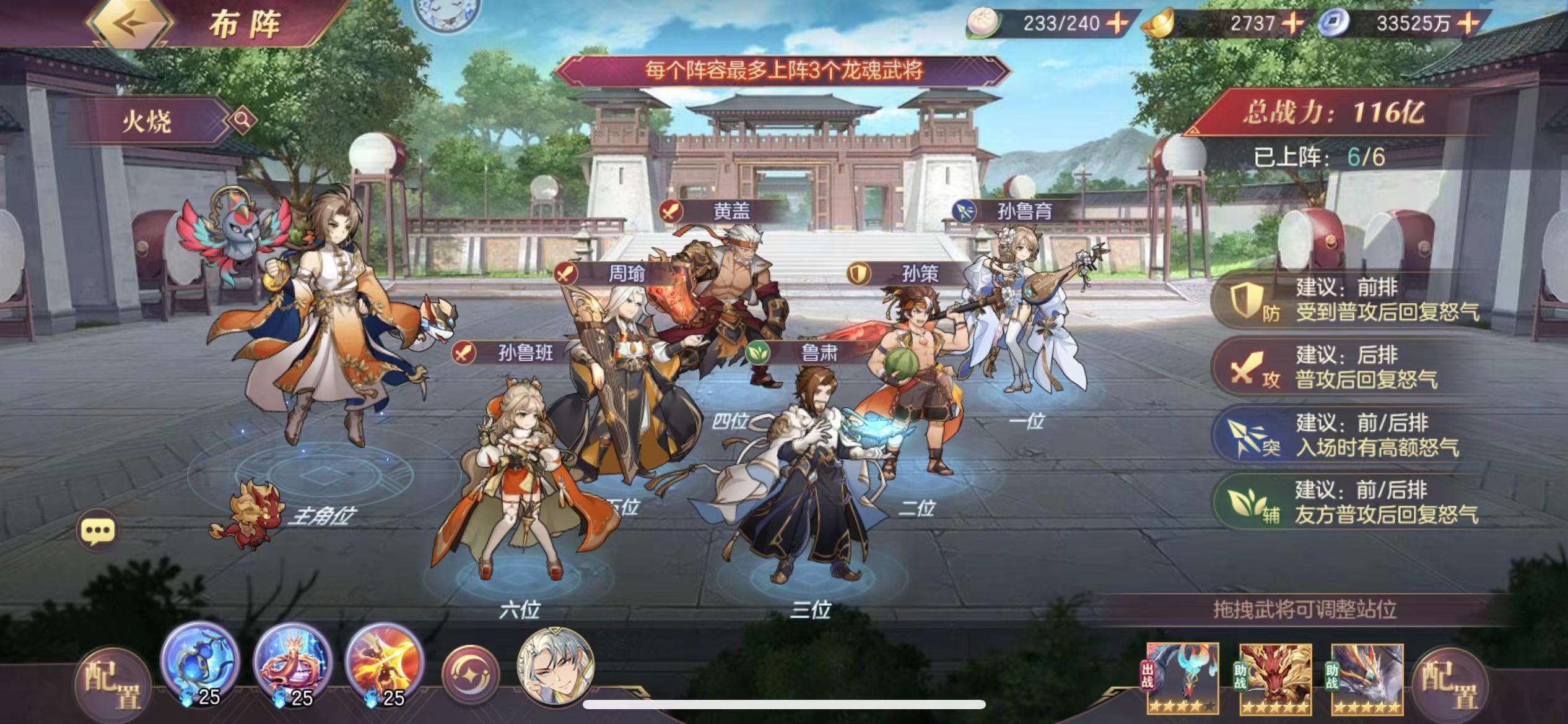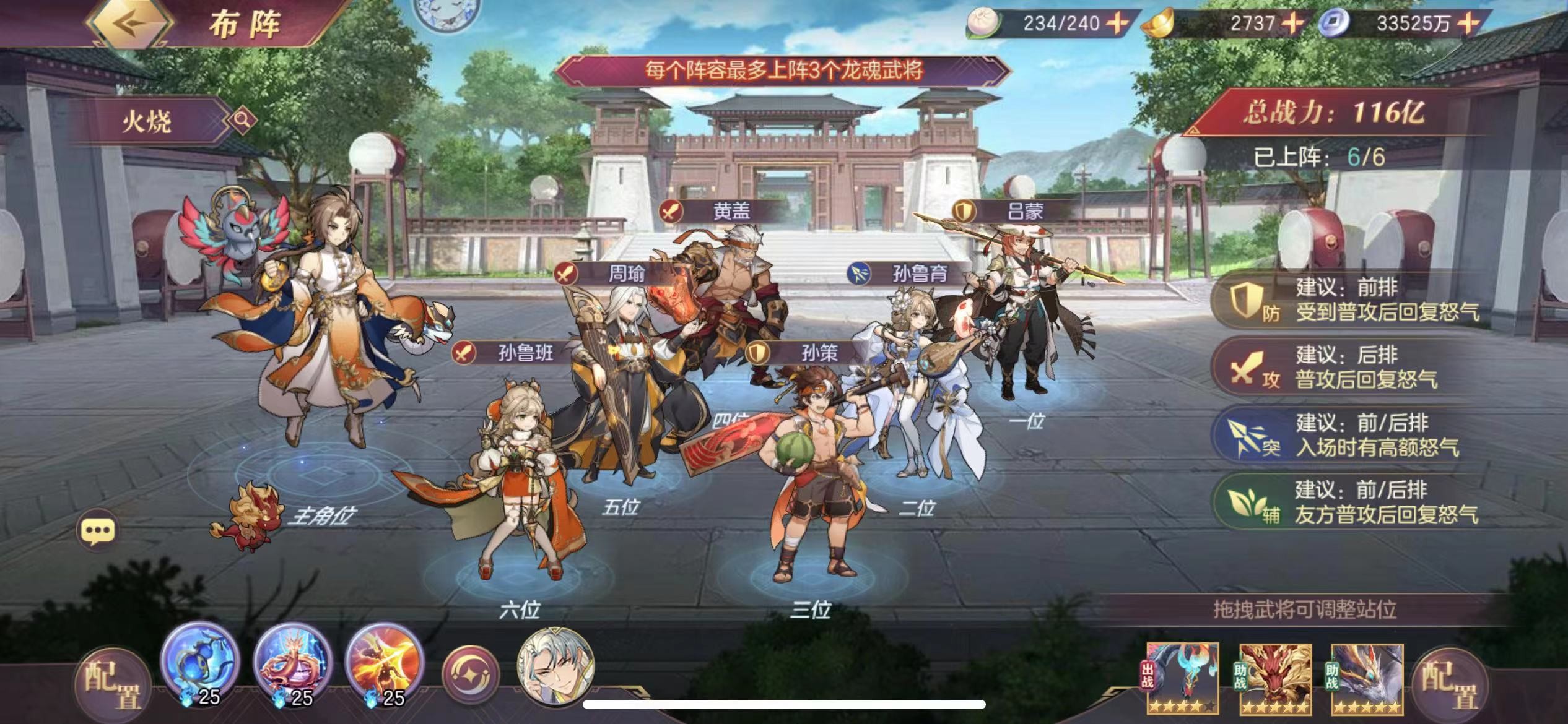 因为考虑到鲁肃存在,孙鲁育凭依(黄盖)后,同列的那个武将是吃不到结盟坦度的,所以这里让黄盖和孙鲁育一列(黄盖肉)。前排1攻孙策,全体1攻黄盖(小虎跳黄盖)。如果顺利开局的话,理应出手顺序是:策瑜羁绊火球 → 大虎追击挂毒 → 小虎凭依黄盖 → 黄盖怒攻 → 周瑜怒攻(周瑜有羁绊的情况下多数是能满怒开局的,后排怒气的价值体现在这里,攻击变突击)。