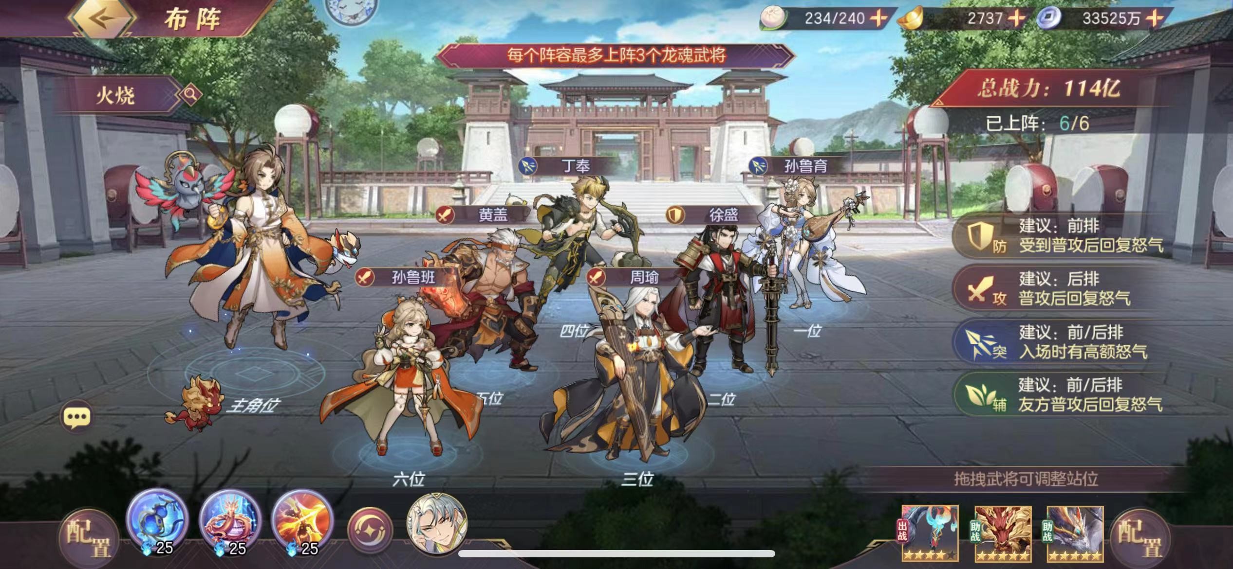 灵宠上,朱雀换毕方,助战依然是烛龙必备,外加一个摇摆位(目前版本腾蛇、夫诸均为不错的选择)。至于火麒麟,在毕方+烛龙后,我认为属于退环境了(理由是输出已经够了),加之SP周瑜被黄盖更替后,火烧整体进攻节奏全面减缓(可以看看火麒麟是否能在第一回合跳2下,以前是可以的),(1)输出已经足量 + (2)进攻节奏放缓 = 火麒麟的退环境。