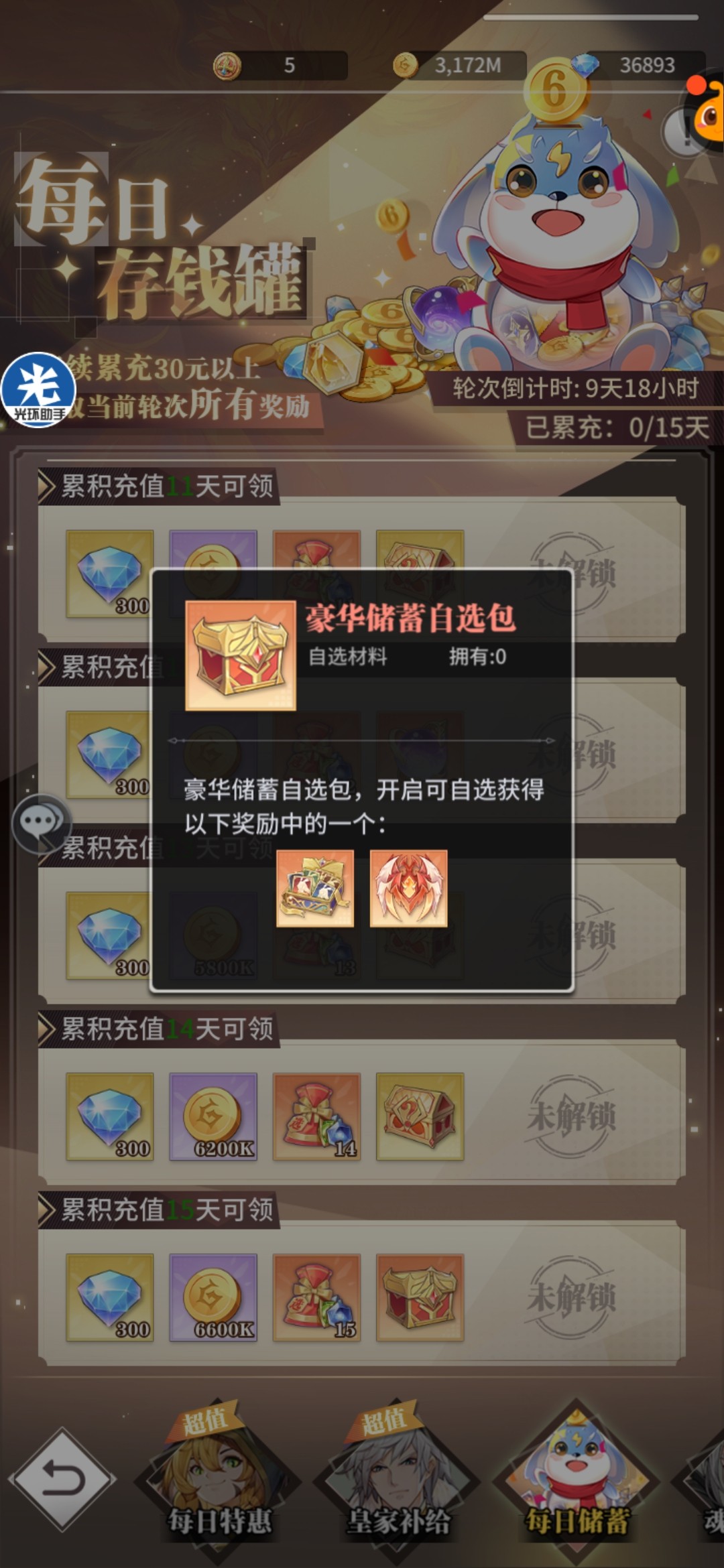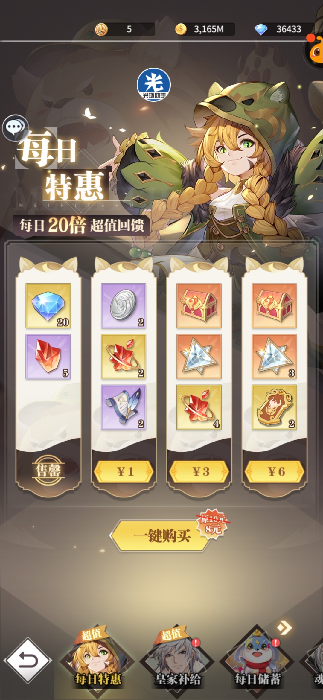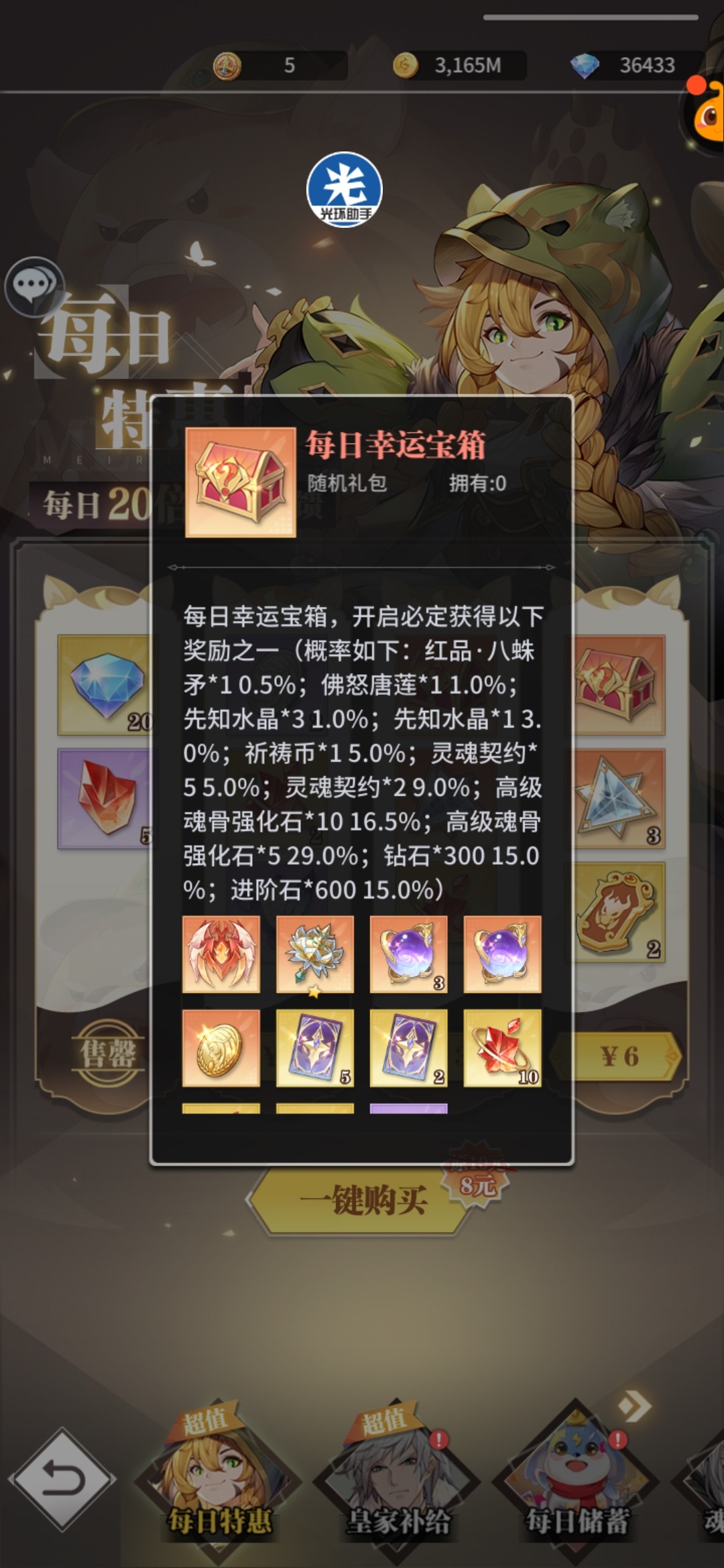 每日特惠8元得2许愿币+6高级魂骨强化石+4自选镜灵碎片+2敏堂刷新卷+2落日狩猎令+2每日幸运宝箱