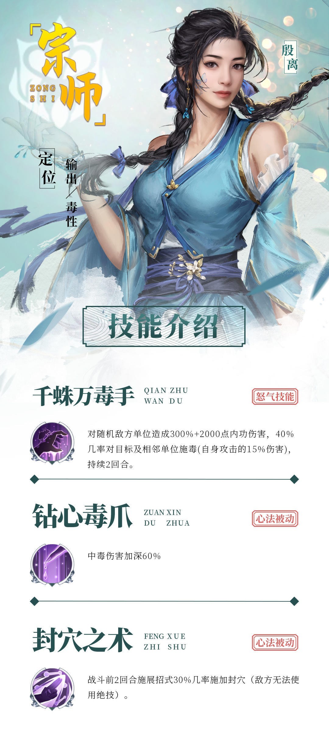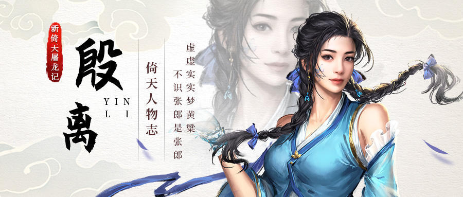 《新倚天屠龙记》人物志-【殷离】阳光浅笑发布于 2022-11-22关注 别号:蛛儿身份:教主殷天正的孙女、天鹰教堂主殷野王之女、金花婆婆(紫衫龙王)的弟子、张无忌的表妹生平:因为不满母亲被欺辱,杀死二娘后逃离,导致母亲也自尽丧命,后遇金花婆婆救其性命,带到灵蛇岛上传授其武功。幼年时在蝶谷初遇少年张无忌,心存爱慕,欲带其到灵蛇岛作伴,被咬伤手背,岂料一咬情根深种。武功:千蛛万毒手特点:绝色佳人、倔强、嘴硬心软、敢爱敢恨