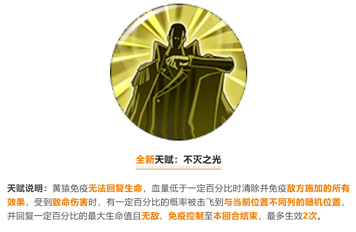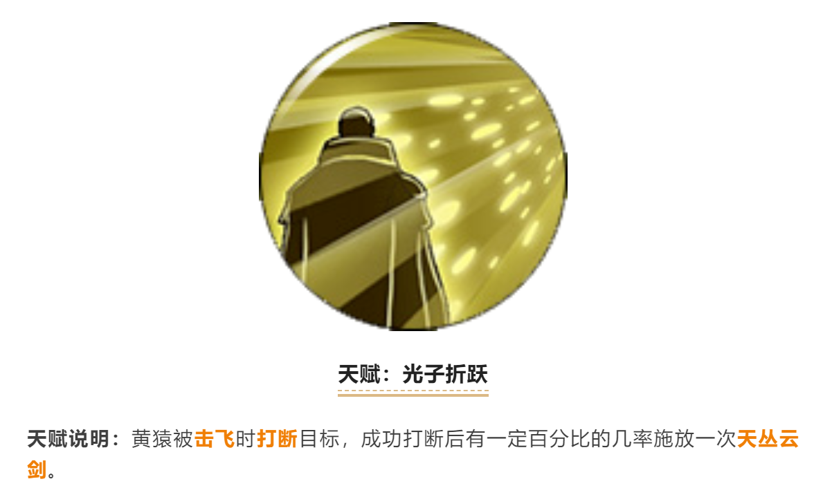 这个天赋就跟名字差不多了,黄猿的保命天赋,受到致命伤害不会直接挂会进入无敌,同时被击飞(释放天丛云剑),所以黄猿挨打中断别人用的好就可以多移除几个人了。