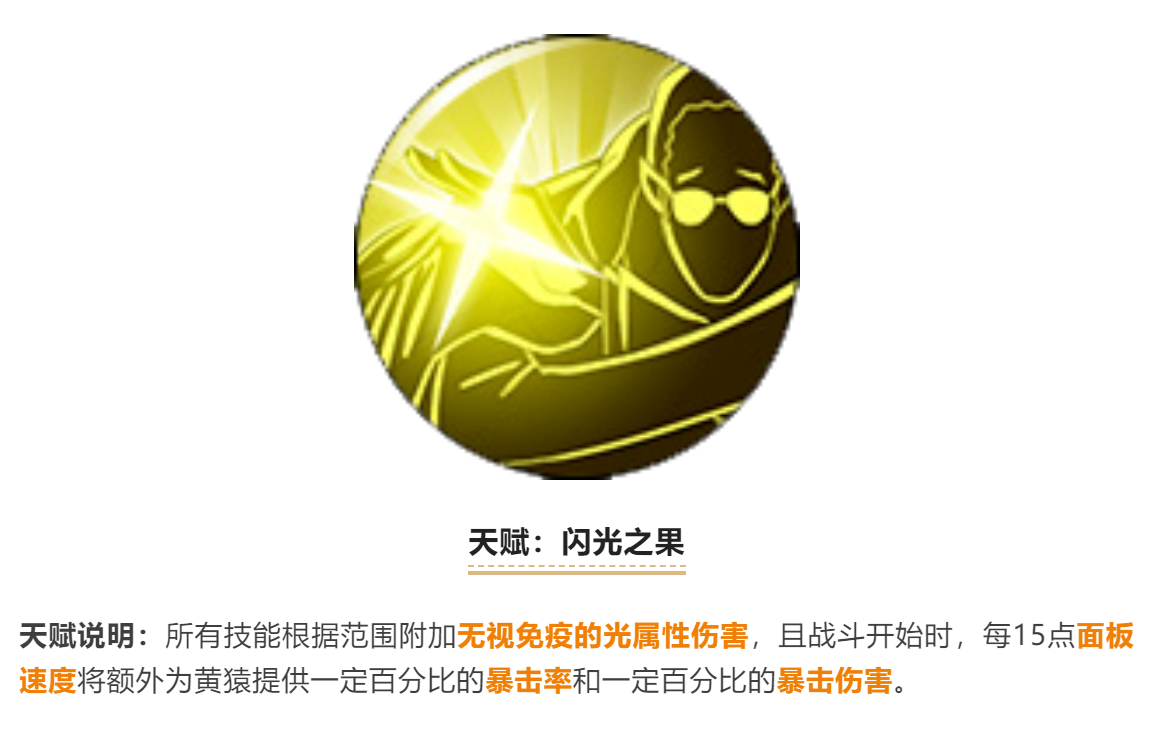 黄猿的经典天赋,老王之前一直在强调的属性转换,把速度转化成爆伤和暴击,同时技能无视免疫。主要这个还是PVE的天赋(估计绝境会有动作了)