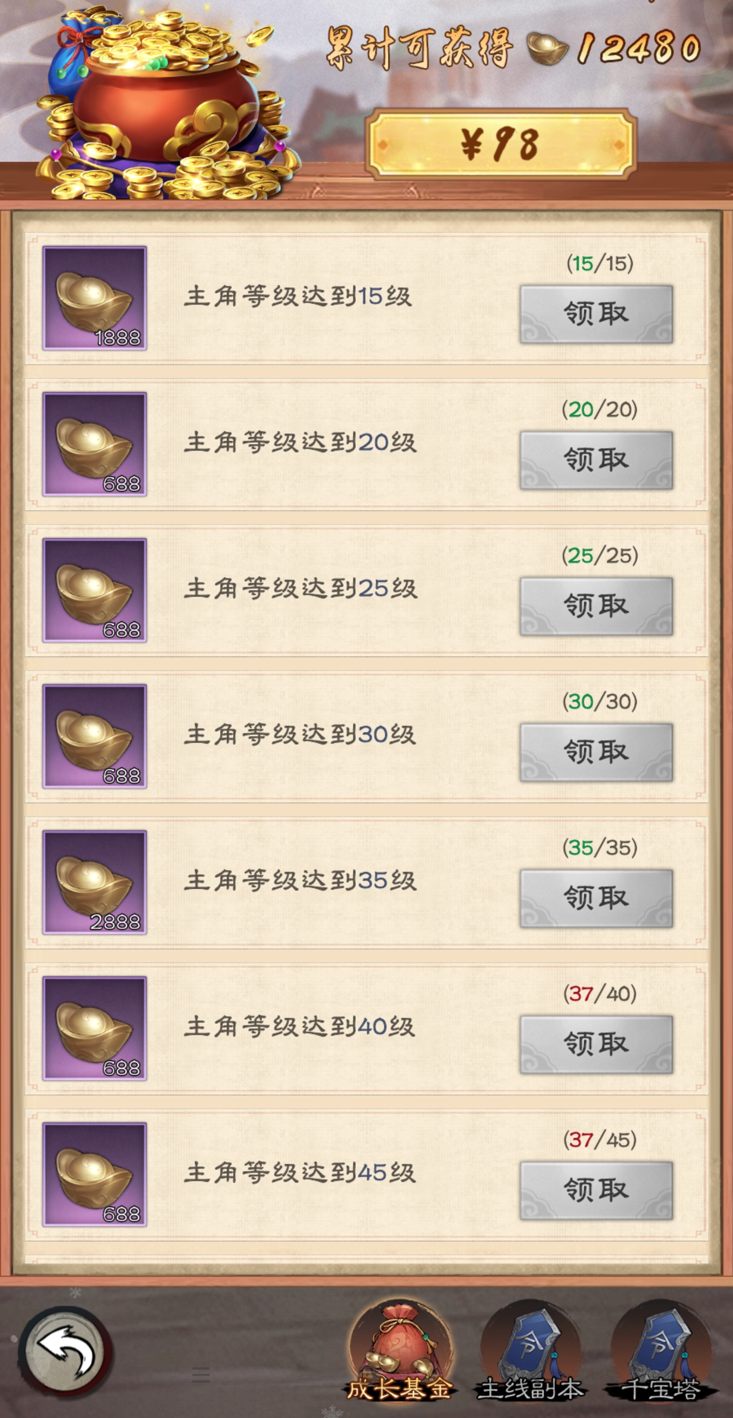 1.江湖游历。最好熬到通过第二十九幕通过第四节王盘山后再进行连续游历(氪金到VIP2否则是自动游历,速度会慢一点),这样可以获得更多的资源,相对于第一节的蝴蝶谷,可获得的功法残页直接翻倍。大大的节省了精力