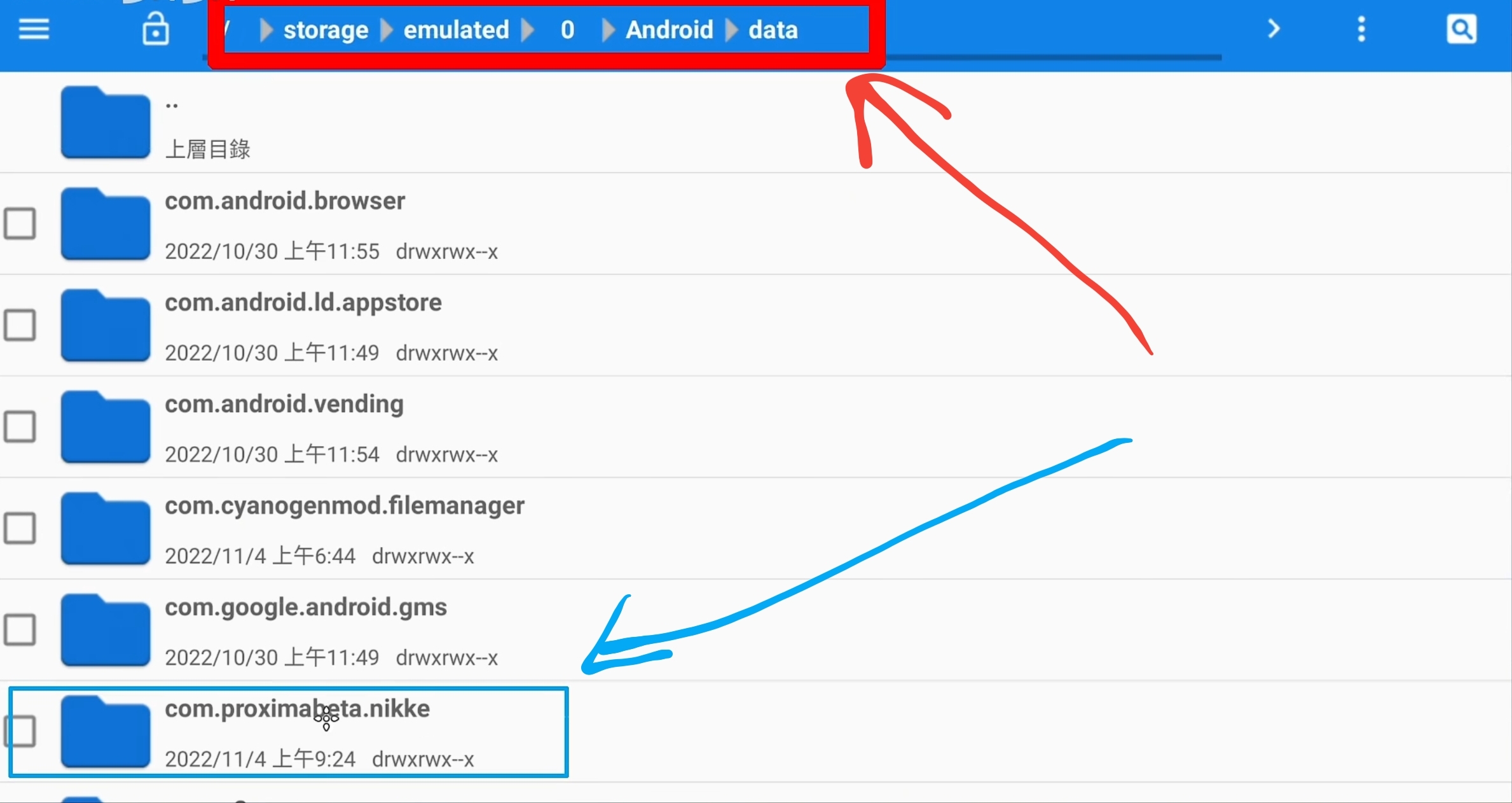 1,为保险起见,先将游戏的存储文件改名,防止系统把这文件夹删了:进入雷电9自带的文件管理器,找到0——Android——Data路径,找到nikke结尾的文件夹,长按这个文件夹选择重命名,给名字后面随便加个字符,比如写个1