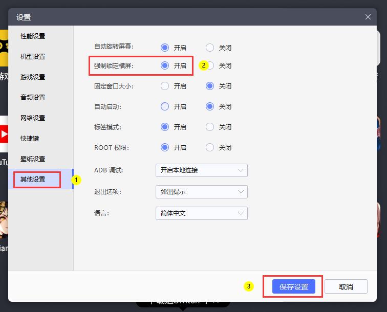 以雷电9为例,在模拟器设置——其他设置中,打开强制横屏选项即可。