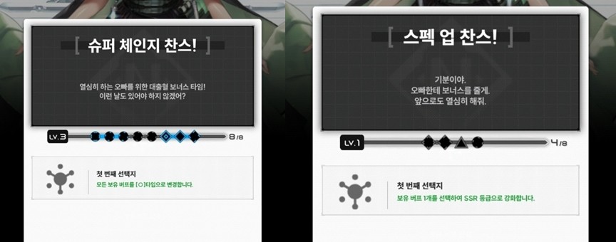 在这种情况下,分别随机出现防御或体力、装弹数量或重新装填、攻击力等相关的 □, △, ○, ◇ buff。