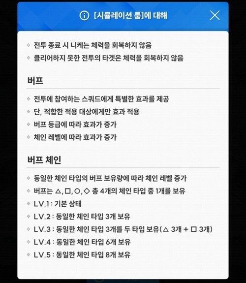 每当进行模拟室的区域时,随机获得□, △, ○, ◇形态中的一些buff。玩家可以从提供的选项中选择获得哪个buff。
