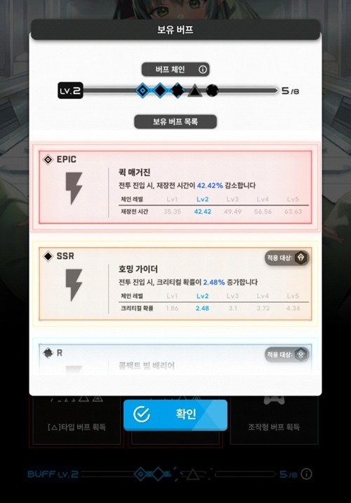 如上所述,buff有□、△、○、◇的形态,根据持有buff种类的数量应用buff链系统,每个buff的效果都会增加。