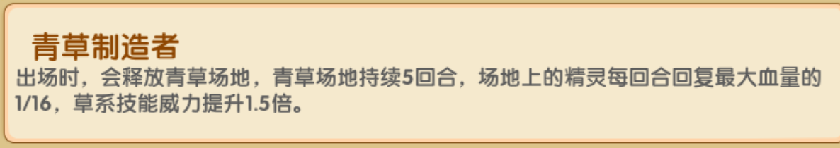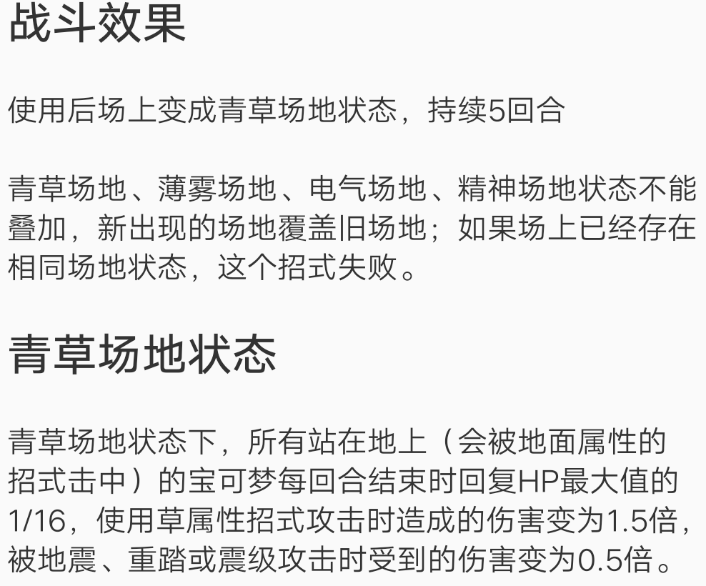【5回合青草场地,新场地可以覆盖旧场地,所有在地面上站着的精灵每回合结束回复HP最大值的1/16,飞行系不行,除非陷入重力,击落等状态。使用草属性招式攻击威力变为1.5倍。被地震,重踏,或震级攻击时受到的伤害变为0.5倍。减半不了千剑】