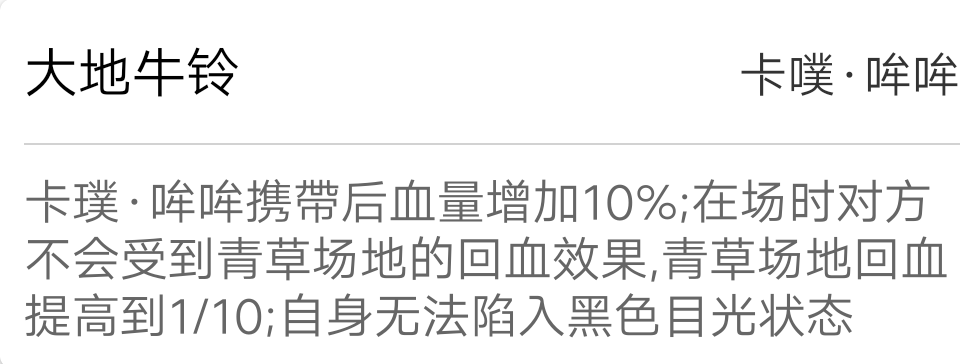 血量增加10%,卡璞哞哞占场时对面不会受到青草场地的回血效果(下场后无效),青草场地回血提高到1/10,自身无法陷入黑色目光状态(不怕鬼抓)