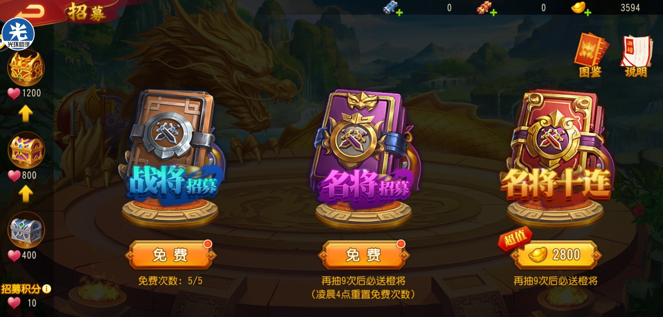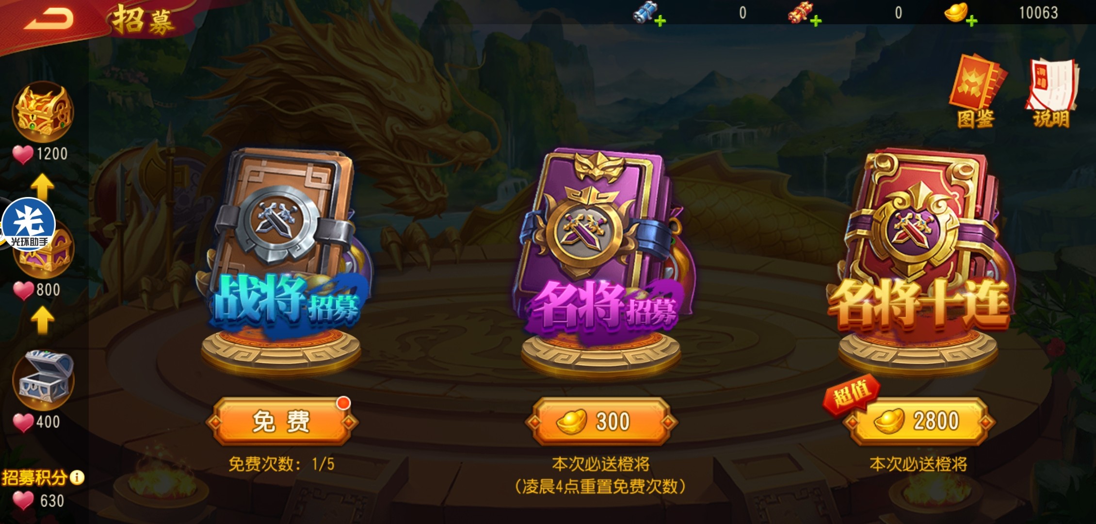同时无论蓝色还是紫色招募都可获得招募积分,达到指定积分可直在左边的宝箱接领取到整武将。1200积分就可以领取一个橙色武将。