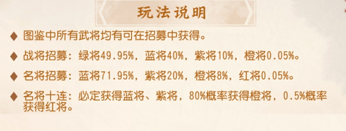 当消耗一定次数的“名将招募”,就可以必定招募到橙色武将,所以每天一次免费机会用掉,日积月累,也能招募到整的橙色武将。