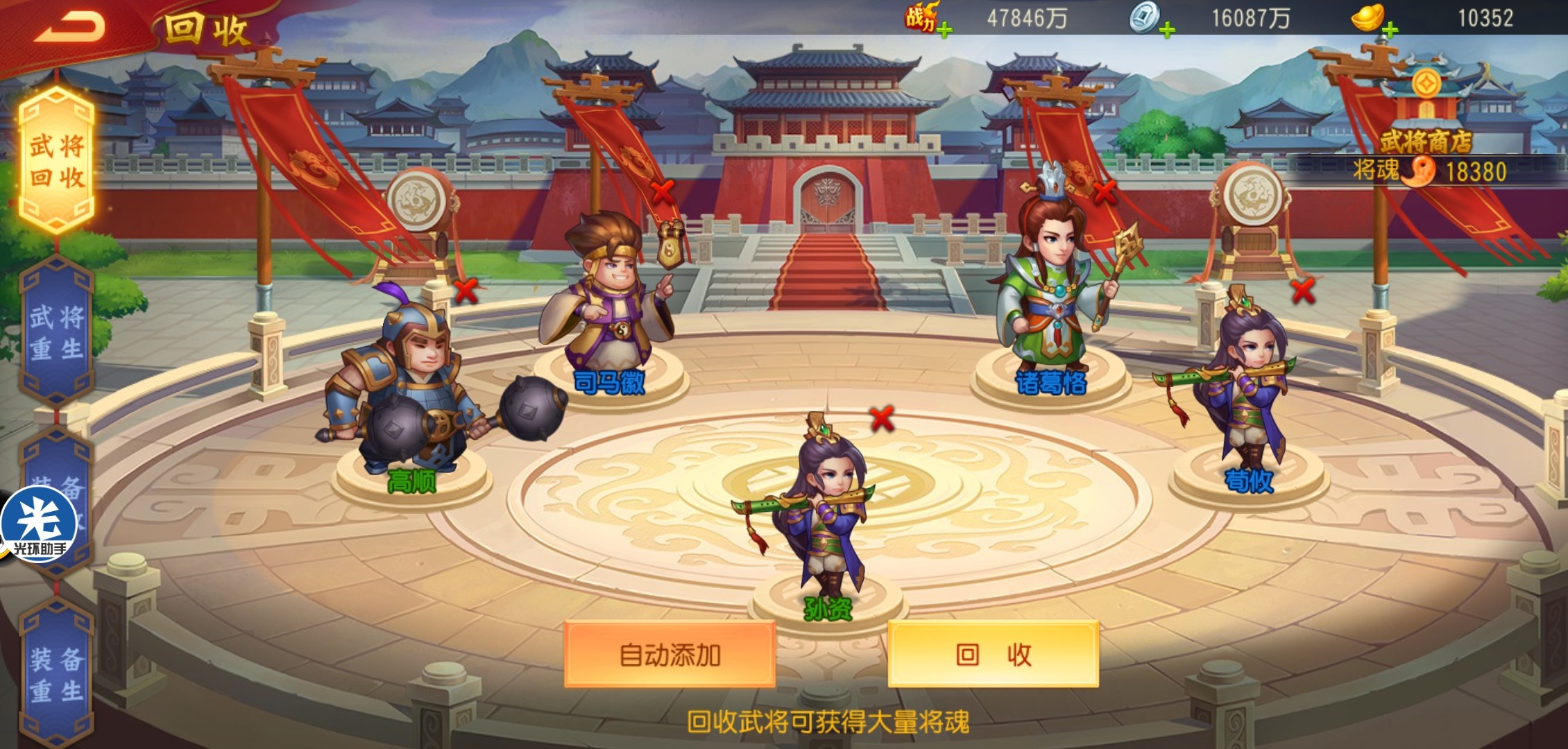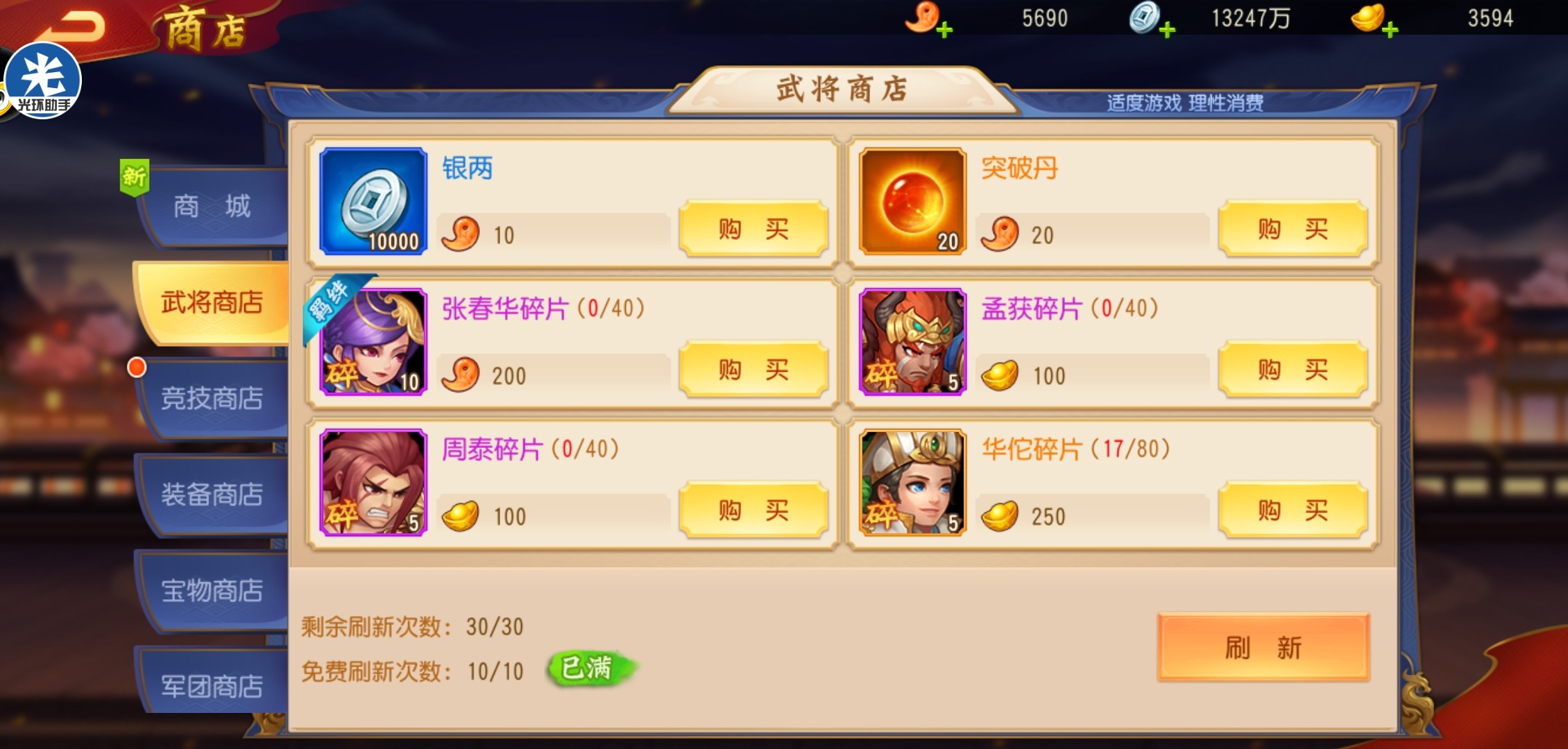 推荐大家尽量用回收的武魂资源购买商店里的武将资源,尽量节约元宝的使用。武魂还可以通过每天的名将副本获得。