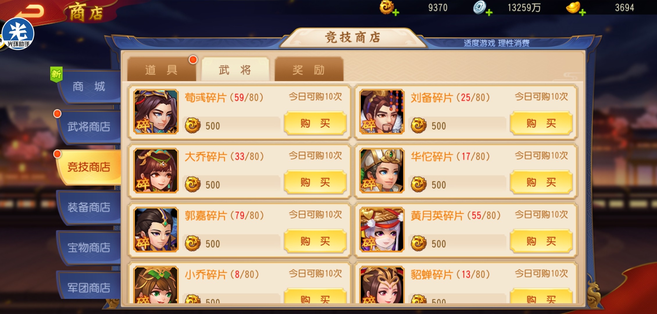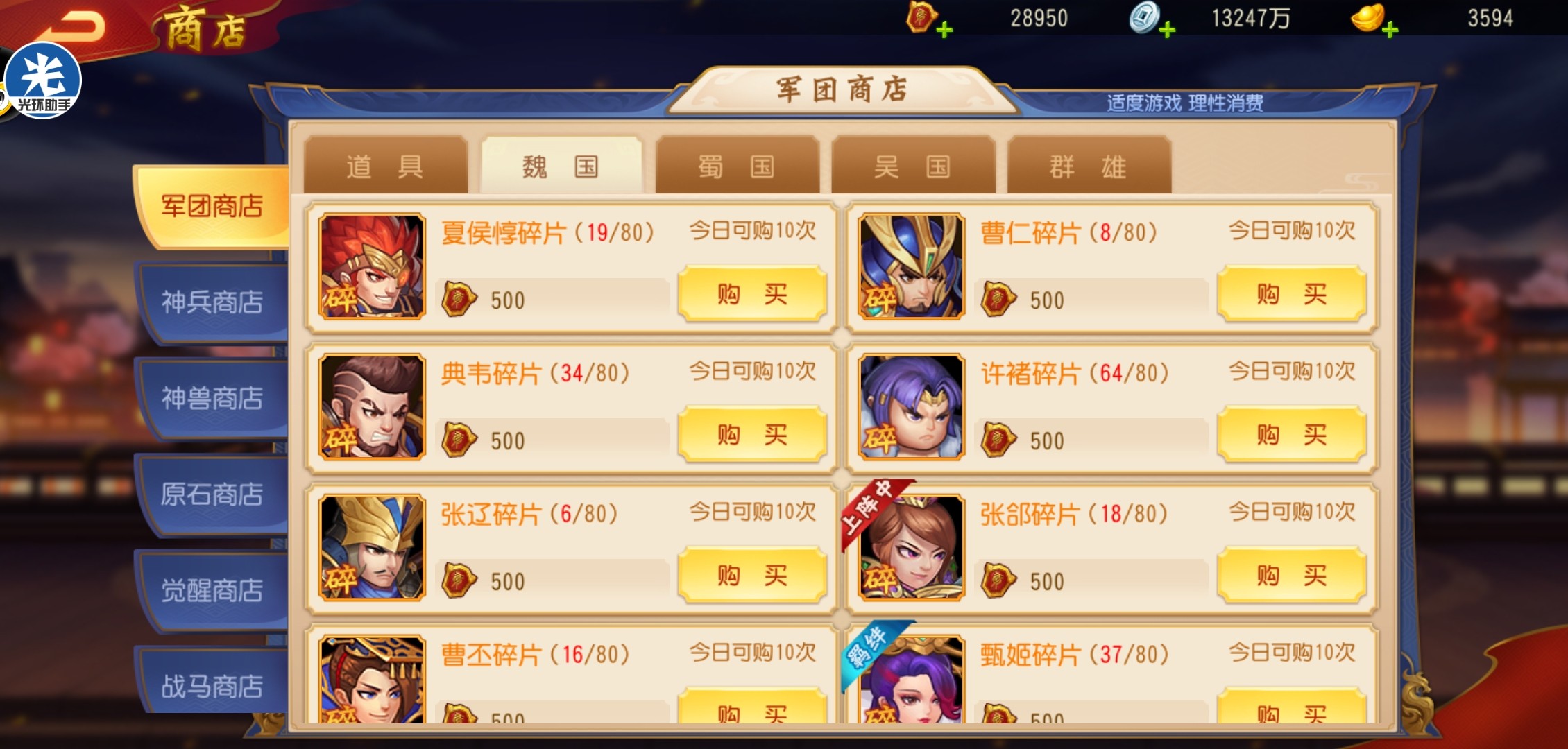 竞技场商店与军团商店对应,主要是四个国家的辅助、治疗武将。