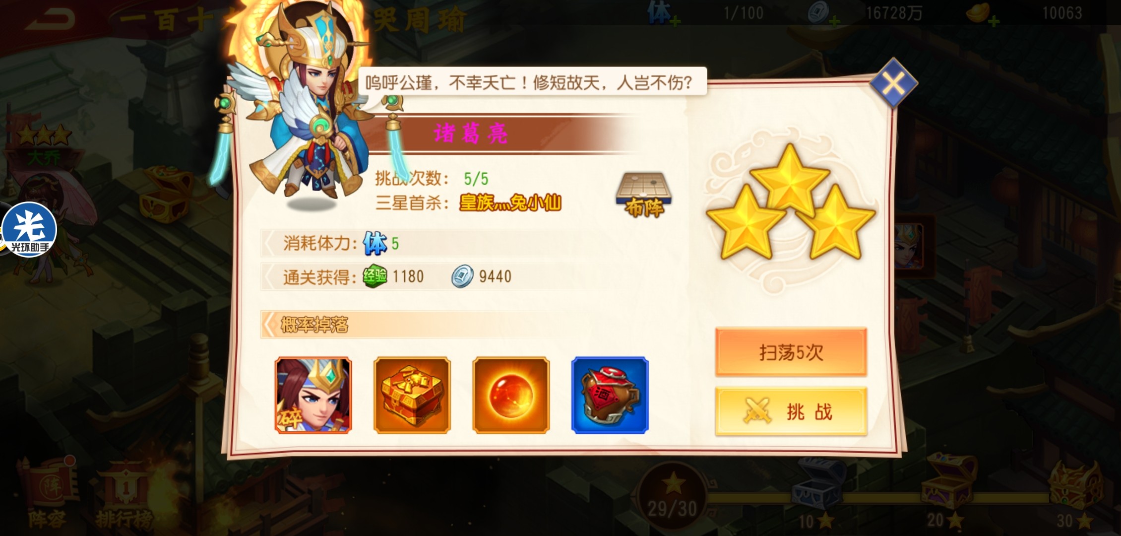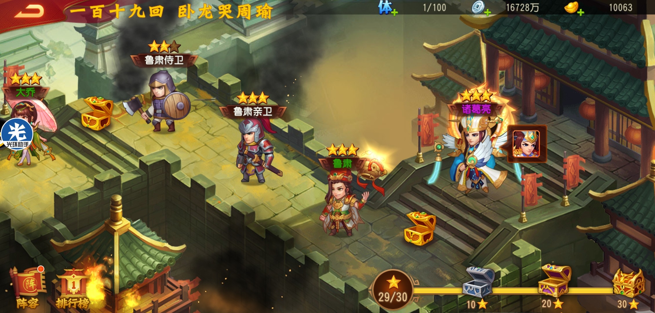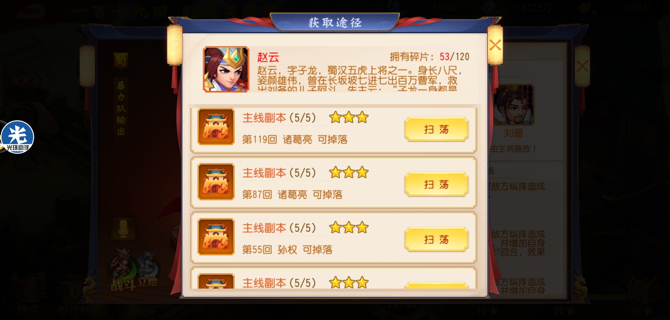 掉落武将碎片的关卡可以通过点击武将“去获取”链接打开,这样就能快速扫荡以前通过的关卡,获取武将碎片资源。