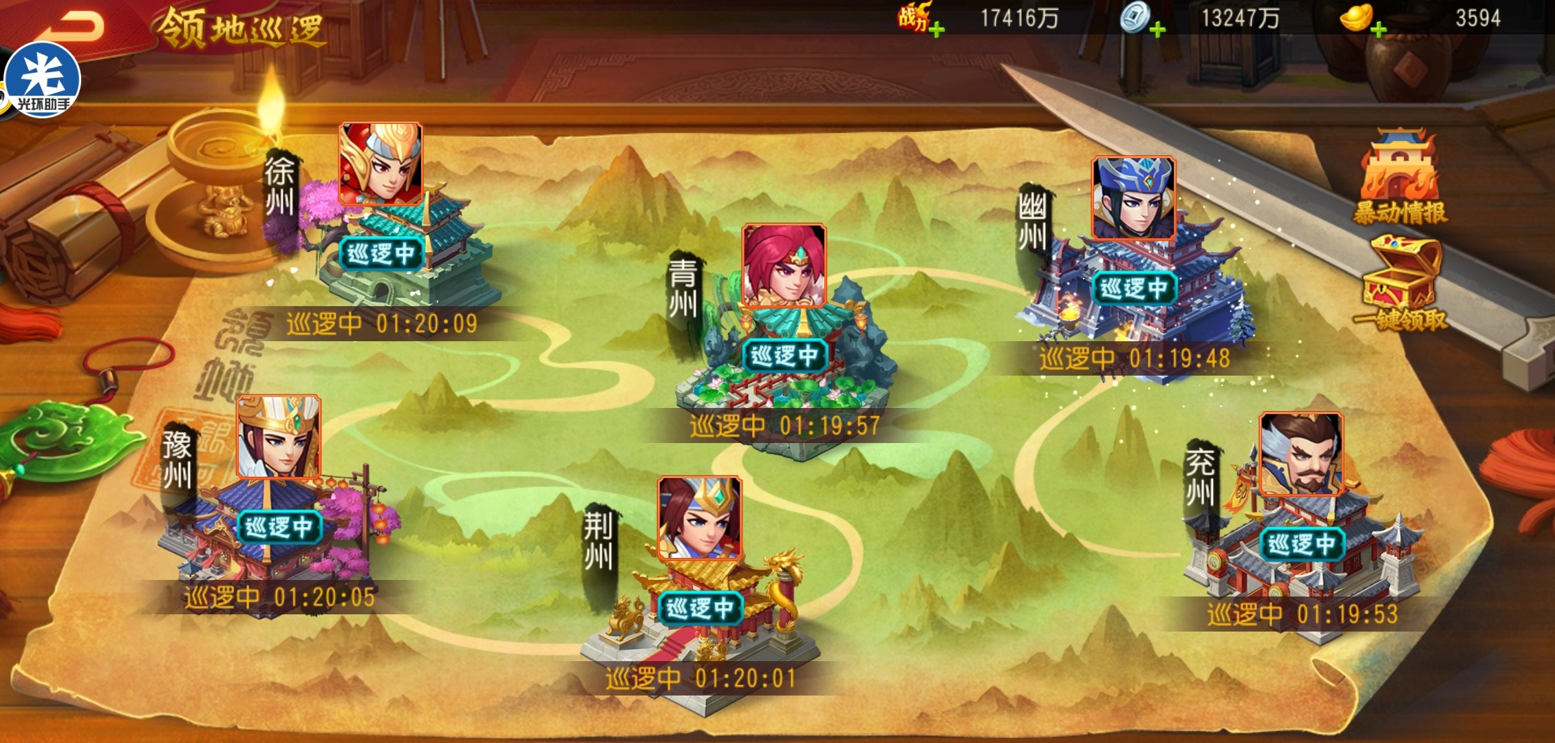派遣拥有的武将进行领地巡逻,必定获得该武将碎片,也有几率直接获得该武将的完整卡片。前期武将资源紧张,缺少整的红将,可以用橙色武将巡逻,后期武将丰富了,尽量选择红色武将巡逻,因为红色武将资源获得途径较小。