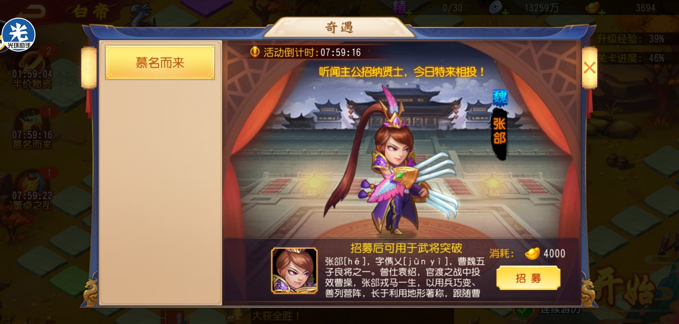 如果是土豪玩家,可以直接“名将十连”,快速获得高品质的武将,回收后获得将魂。平民的话直推开区的第一天快速获得橙色武将,进行一次十连抽,后期只要进行蓝色和紫色招募就可以。