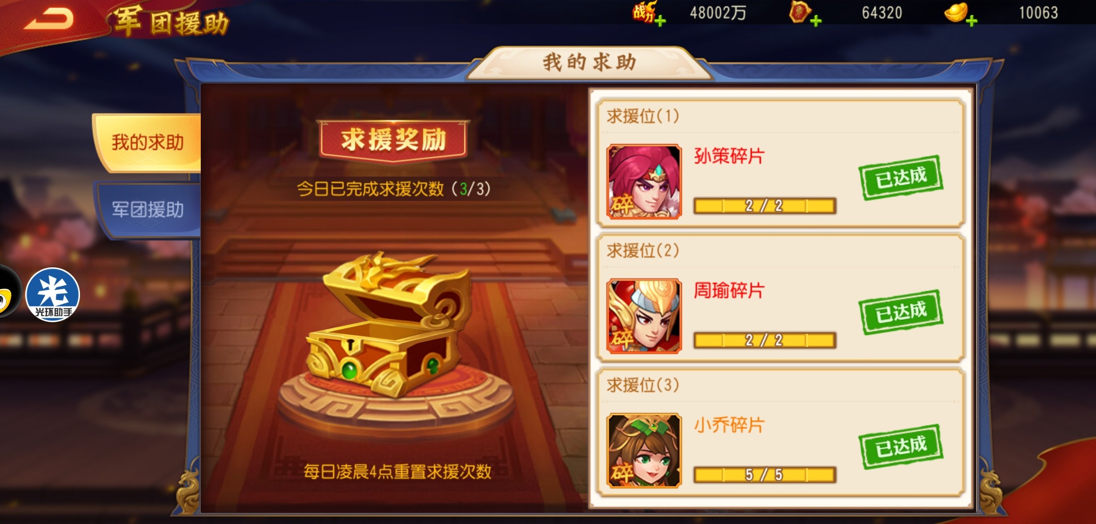 前期军团等级低只能选择绿色、蓝色、紫色、橙色品质的武将求助,通常都是选择三个橙色武将,每天可以求助15个碎片。