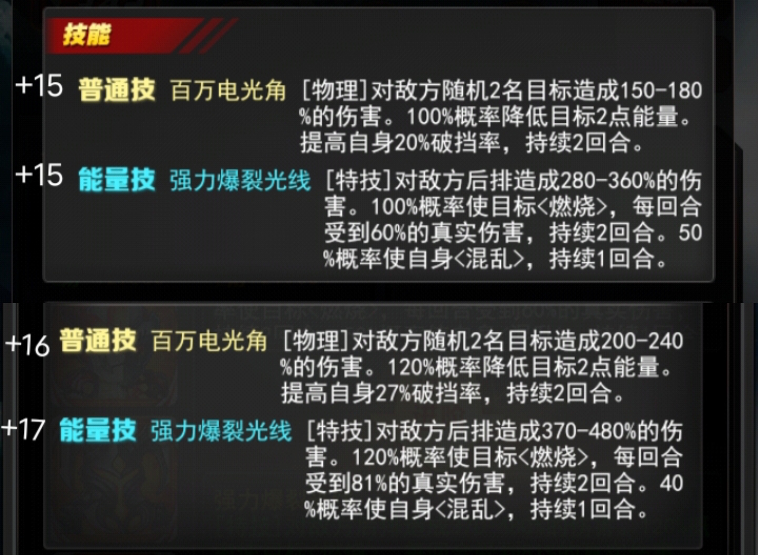 +17 能量技 强力爆裂光线[特技]对敌方后排造成370-480%的伤害。120%概率使目标<燃烧>,每回合