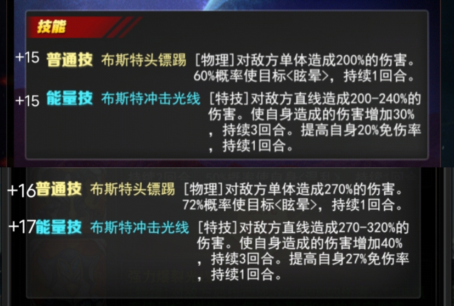 +17能量技 布斯特冲击光线[特技]对敌方直线造成270-320%的伤害。使自身造成的伤害增加40%