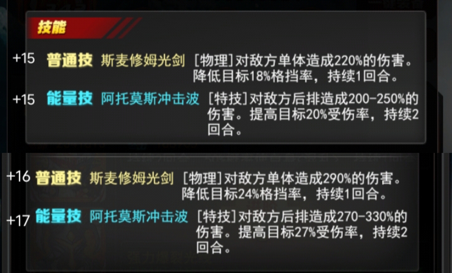 +17能量技阿托莫斯冲击波[特技]对敌方后排造成270-330%的伤害。提高目标27%受伤率,持续2