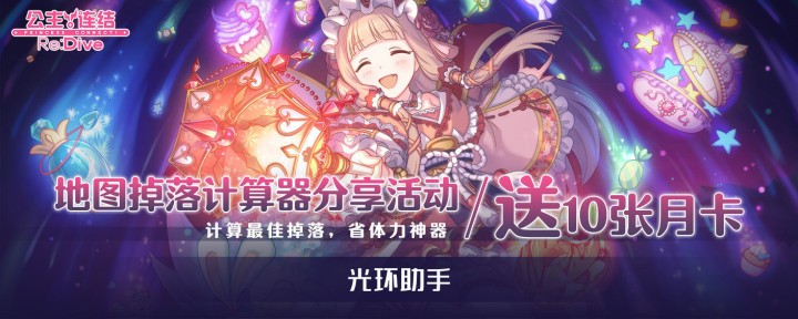 【活动介绍】:好工具,齐分享!使用分享功能,把“素材掉落计算器”分享到B站动态,QQ空间或者公主连结相关的Q群!并在活动的问题下(不是本文)进行回答并上传截图,即有机会获得月卡奖励!在符合要求的骑士君中随机抽出10位送出月卡。