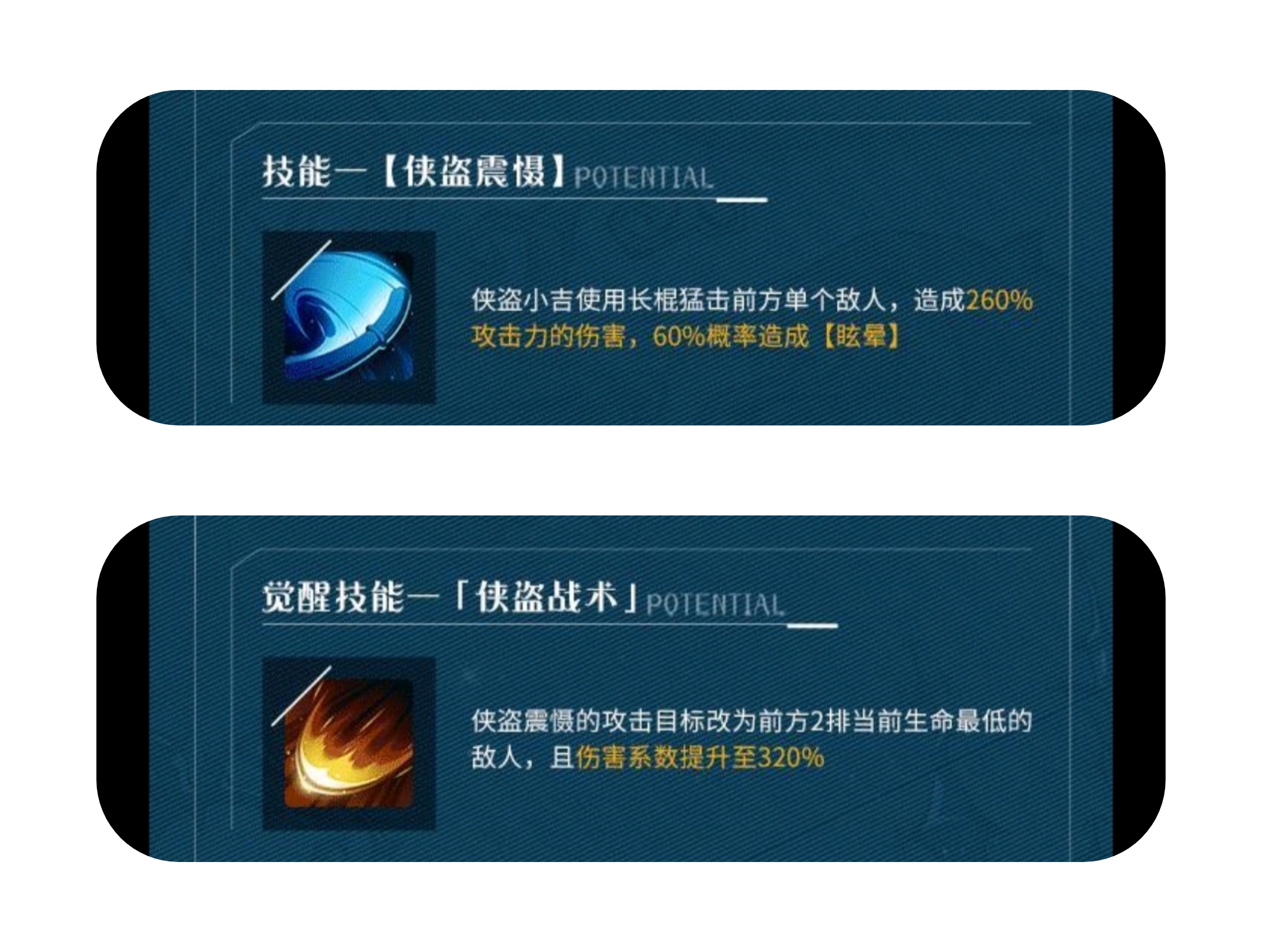 觉醒技能一:使其一技能目标改为前中排生命最低单位,并提高其伤害系数。